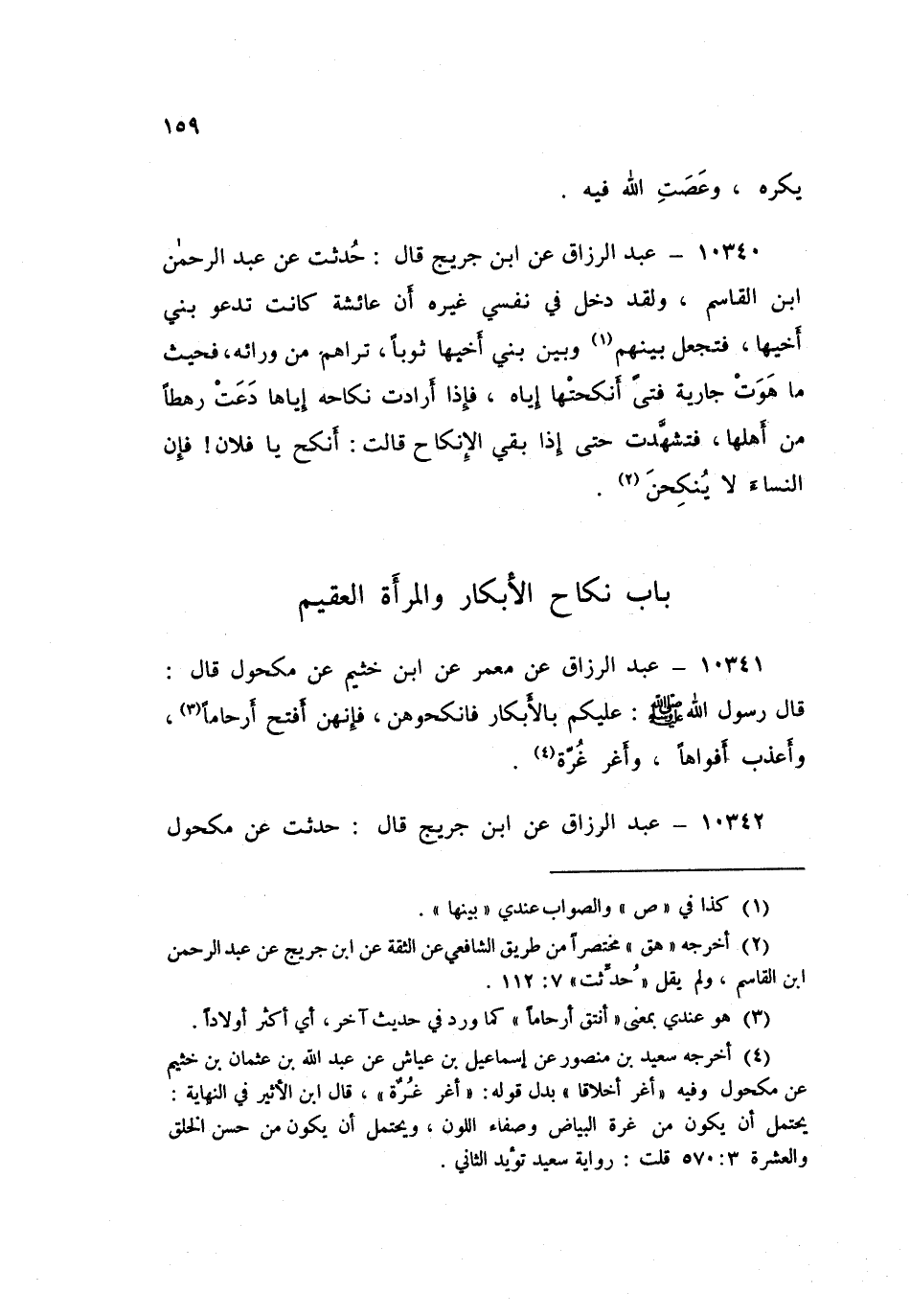 ١٠٣٤٢ - عَنِ ابْنِ جُرَيْجٍ قَالَ: حُدِّثْتُ، عَنْ مَكْحُولٍ قَالَ: قَالَ رَسُولُ اللَّهِ صَلَّى اللهُ عَلَيْهِ وَسَلَّمَ: «أَنْكِحُوا الْجَوَارِيَ الْأَبْكَارَ، فَإِنَّهُنَّ أَطْيَبُ أَفْوَاهًا، وَأَنْظَفُ أَرْحَامًا، وَأَغَرُّ أَخْلَاقًا، أَلَمْ تَعْلَمُوا أَنِّي مُكَاثِرٌ بِكُمْ، وَأَنَّ ذَرَارِيَّ الْمُؤْمِنِينَ فِي شَجَرَةٍ مِنْ عُصَادِ الْجَنَّةِ يَكْفُلُهُمْ أَبُوهُمْ إِبْرَاهِيمُ عَلَيْهِ السَّلَامُ»
