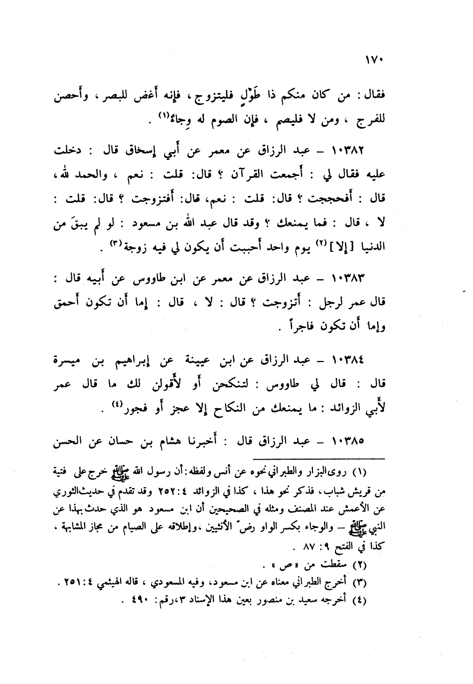 ١٠٣٨٤ - عَنِ ابْنِ عُيَيْنَةَ، عَنْ إِبْرَاهِيمَ بْنِ مَيْسَرَةَ قَالَ: قَالَ لِي طَاوُسٌ: لِتَنْكِحَنَّ أَوْ لَأَقُولَنَّ لَكَ مَا قَالَ عُمَرُ لِأَبِي الزَّوَائِدِ: «مَا يَمْنَعُكَ مِنَ النِّكَاحِ إِلَّا عَجْزٌ أَوْ فُجُورٌ»