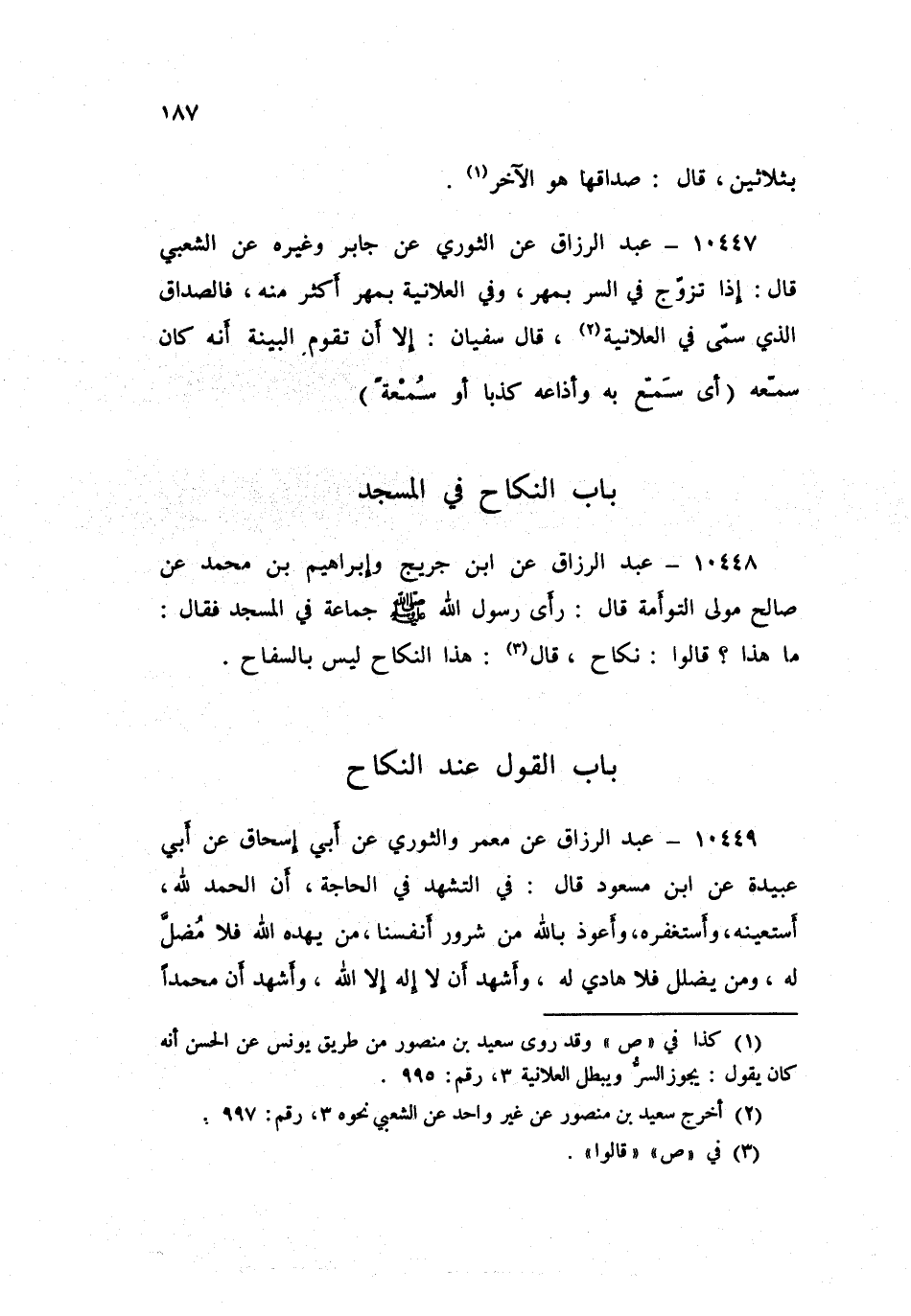 ١٠٤٤٨ - عَنِ ابْنِ جُرَيْجٍ، وَإِبْرَاهِيمِ بْنِ مُحَمَّدٍ، عَنْ صَالِحٍ، مَوْلَى التَّوْأَمَةِ قَالَ: رَأَى رَسُولُ اللَّهِ صَلَّى اللهُ عَلَيْهِ وَسَلَّمَ جَمَاعَةً فِي الْمَسْجِدِ، فَقَالَ: «مَا هَذَا؟» قَالُوا: نِكَاحٌ قَالَ: «هَذَا النِّكَاحُ لَيْسَ بِالسِّفَاحِ»