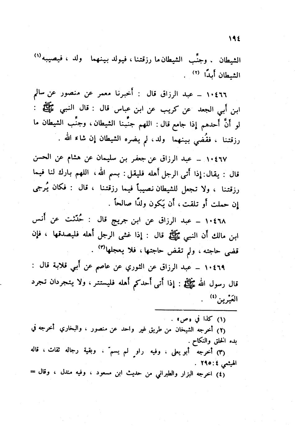١٠٤٦٦ - عَبْدُ الرَّزَّاقِ، أَخْبَرَنَا مَعْمَرٌ، عَنْ مَنْصُورٍ، عَنْ سَالِمِ بْنِ أَبِي الْجَعْدِ، عَنْ كُرَيْبٍ، عَنِ ابْنِ عَبَّاسٍ قَالَ: قَالَ النَّبِيُّ صَلَّى اللهُ عَلَيْهِ وَسَلَّمَ: " لَوْ أَنَّ أَحَدَهُمْ إِذَا جَامَعَ قَالَ: اللَّهُمَّ، جَنِّبْنَا الشَّيْطَانَ، وَجَنِّبِ الشَّيْطَانَ مَا رَزَقْتَنَا، فَقُضِيَ بَيْنَهُمَا وَلَدٌ، لَمْ يَضُرَّهُ الشَّيْطَانُ إِنْ شَاءَ اللَّهُ "
