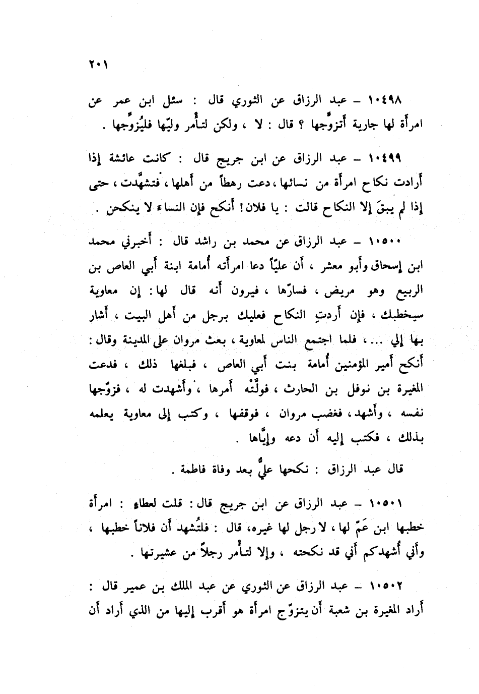 ١٠٤٩٩ - عَنِ ابْنِ جُرَيْجٍ قَالَ: كَانَتْ عَائِشَةُ إِذَا أَرَادَتْ نِكَاحَ امْرَأَةٍ مِنْ نِسَائِهَا، دَعَتْ رَهْطًا مِنْ أَهْلِهَا، فَتَشَهَّدَتْ حَتَّى إِذَا لَمْ يَبْقَ إِلَّا النِّكَاحُ قَالَتْ: «يَا فُلَانُ، أَنْكِحْ، فَإِنَّ النِّسَاءَ لَا يُنْكِحْنَ»