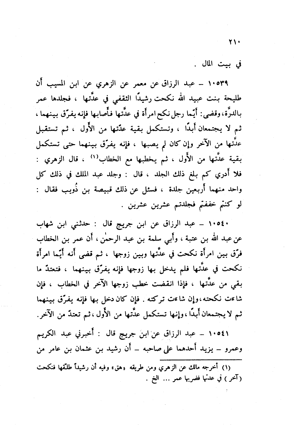 ١٠٥٤١ - عَنِ ابْنِ جُرَيْجٍ، قَالَ أَخْبَرَنِي عَبْدُ الْكَرِيمِ، وَعَمْرٌو، يَزِيدُ أَحَدُهُمَا عَلَى صَاحِبِهِ، أَنَّ رُشَيْدَ بْنَ عُثْمَانَ بْنِ عَامِرٍ، مِنْ بَنِي مُعْتِبٍ الثَّقَفِيِّ نَكَحَ طُلَيْحَةَ بِنْتَ عُبَيْدِ اللَّهِ أُخْتِ طَلْحَةَ بْنِ عُبَيْدِ اللَّهِ فِي بَقِيَّةِ عِدَّتِهَا مِنْ آخَرَ، وَأَنَّ عُمَرَ بْنَ الْخَطَّابِ قَالَ: «إِنْ كَانَ دَخَلَ بِهَا فُرِّقَ بَيْنَهُمَا، ثُمَّ لَا يَنْكِحُهَا أَبَدًا، وَلَهَا الصَّدَاقُ بِمَا أَصَابَ مِنْهَا، ثُمَّ تَعْتَدُّ بَقِيَّةَ عِدَّتِهَا، ثُمَّ تَعْتَدُّ مِنْ هَذَا، وَإِنْ كَانَ لِمْ يَدْخُلِ اعْتَدَّتْ بَقِيَّةَ عِدَّتِهَا، ثُمَّ نَكَحَهَا إِنْ شَاءَتْ». قُلْتُ: ذَكَرُوا جَلْدًا، قَالَ