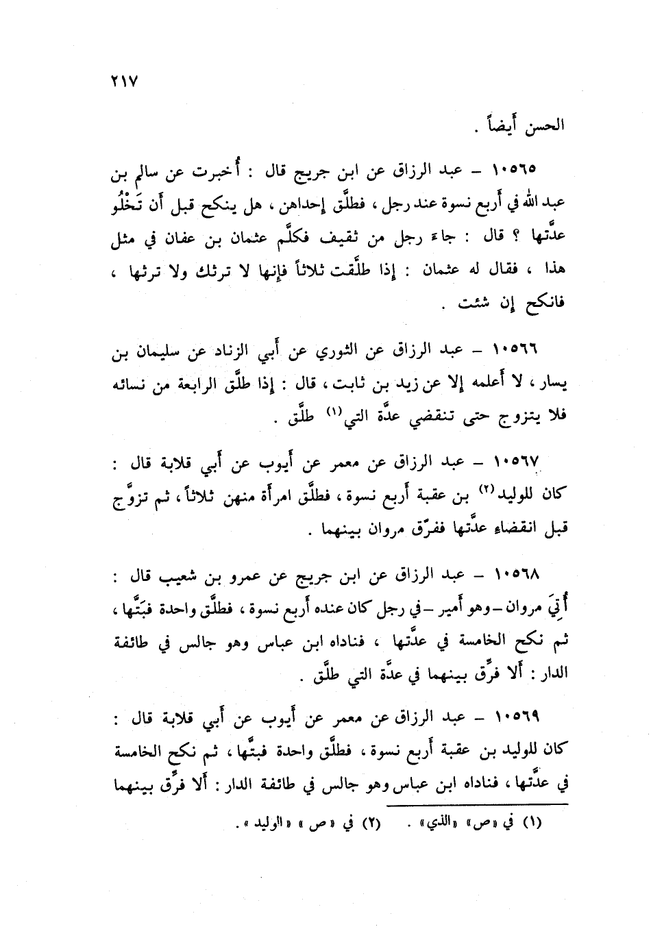 ١٠٥٦٨ - عَنِ ابْنِ جُرَيْجٍ، عَنْ عَمْرِو بْنِ شُعَيْبٍ قَالَ: أُتِيَ مَرْوَانُ وَهُوَ أَمِيرٌ فِي رَجُلٍ كَانَ عِنْدَهُ أَرْبَعُ نِسْوَةٍ، فَطَلَّقَ وَاحِدَةً فَبَتَّهَا، ثُمَّ نَكَحَ الْخَامِسَةَ فِي عِدَّتِهَا، فَنَادَاهُ ابْنُ عَبَّاسٍ وَهُوَ جَالِسٌ فِي طَائِفَةِ الدَّارِ: «أَلَا فَرِّقْ بَيْنَهُمَا فِي عِدَّةِ الَّتِي طَلَّقَ»