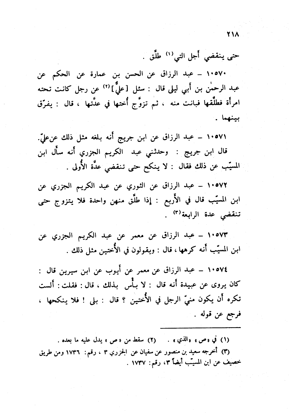 ١٠٥٧٤ - عَنْ مَعْمَرٍ، عَنْ أَيُّوبَ، عَنِ ابْنِ سِيرِينَ قَالَ: كَانَ يُرْوَى عَنْ عَبِيدَةَ، أَنَّهُ قَالَ: «لَا بَأْسَ بِذَلِكَ» قَالَ: فَقُلْتُ: أَلَسْتَ تَكْرَهُ أَنْ يَكُونَ مِنِّي الرَّجُلُ فِي الْأُخْتَيْنِ؟ قَالَ: «بَلَى، فَلَا يَنْكِحُهَا فَرَجَعَ عَنْ قَوْلِهِ»