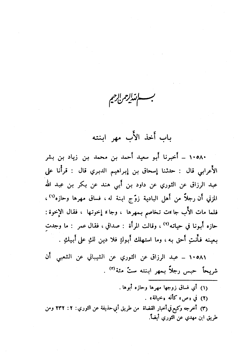 ١٠٥٨٠ - أَخْبَرَنَا أَبُو سَعِيدٍ أَحْمَدُ بْنُ مُحَمَّدِ بْنِ زِيَادِ بْنِ بِشْرٍ الْأَعْرَابِيُّ قَالَ: حَدَّثَنَا إِسْحَاقُ بْنُ إِبْرَاهِيمَ الدَّبَرِيُّ قَالَ: قَرَأْنَا عَلَى عَبْدِ الرّزَّاقِ عَنِ الثَّوْرِيِّ، عَنْ دَاوُدَ بْنِ أَبِي هِنْدَ، عَنْ بَكْرِ بْنِ عَبْدِ اللَّهِ الْمُزَنِيِّ: أَنَّ رَجُلًا مِنْ أَهْلِ الْبَادِيَةِ زَوَّجَ ابْنَةً لَهُ، فَسَاقَ مَهْرَهَا وَحَازَهُ، فَلَمَّا مَاتَ الْأَبُ جَاءَتْ تُخَاصِمُ بِمَهْرِهَا، وَجَاءَ إِخْوَتُهَا، فَقَالَ الْإِخْوَةُ: حَازَهُ أَبُونَا فِي حَيَاتِهِ، وَقَالَتِ الْمَرْأَةُ: صَدَاقِي، فَقَالَ عُمَرُ: «مَا وَجَدْتِ بِعَيْنِهِ فَأَنْتِ أَحَقُّ بِهِ، وَمَا اسْتَهْلَكَ أَبُوكِ فَلَا دَيْنَ لَكِ عَلَى أَبِيكِ»