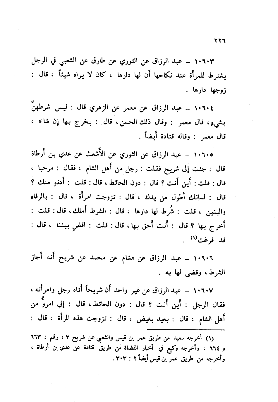 ١٠٦٠٧ - عَنْ غَيْرِ وَاحِدٍ: أَنَّ شُرَيْحًا أَتَاهُ رَجُلٌ وَامْرَأَتُهُ، فَقَالَ الرَّجُلُ: أَيْنَ أَنْتَ؟ قَالَ: «دُونَ الْحَائِطِ» قَالَ: إِنِّي امْرُؤٌ مِنْ أَهْلِ الشَّامِ قَالَ: «بَعِيدٌ بَغِيضٌ» قَالَ: تَزَوَّجْتُ هَذِهِ الْمَرْأَةَ قَالَ: «بِالرِّفَاءِ وَالْبَنِينِ» قَالَ: فَوَلَدَتْ لِي غُلَامًا قَالَ: «يَهْنِئُكَ الْفَارِسُ» قَالَ: فَأَرَدْتُ الْخُرُوجَ بِهَا إِلَى الشَّامِ قَالَ: «مُصَاحَبًا» قَالَ: وَشَرَطْتُ لَهَا دَارَهَا قَالَ: «فَالشَّرْطُ أَمْلَكُ» قَالَ: فَاقْضِ بَيْنَنَا أَصْلَحَكَ اللَّهُ قَالَ: «حَدِيثُ حَدِيثَيْنِ امْرَأَةً فَإِنْ أَبَتْ فَأَرْبَعَةٌ». قَالَ عَبْدُ الرَّزَّاقِ: " غَيْرُ مَعْمَرٍ يَقُولُ: «حَدِّثْ حَدِيثَيْنِ امْرَأً، فَإِنْ أَبَى فَأَرْبَعٌ»