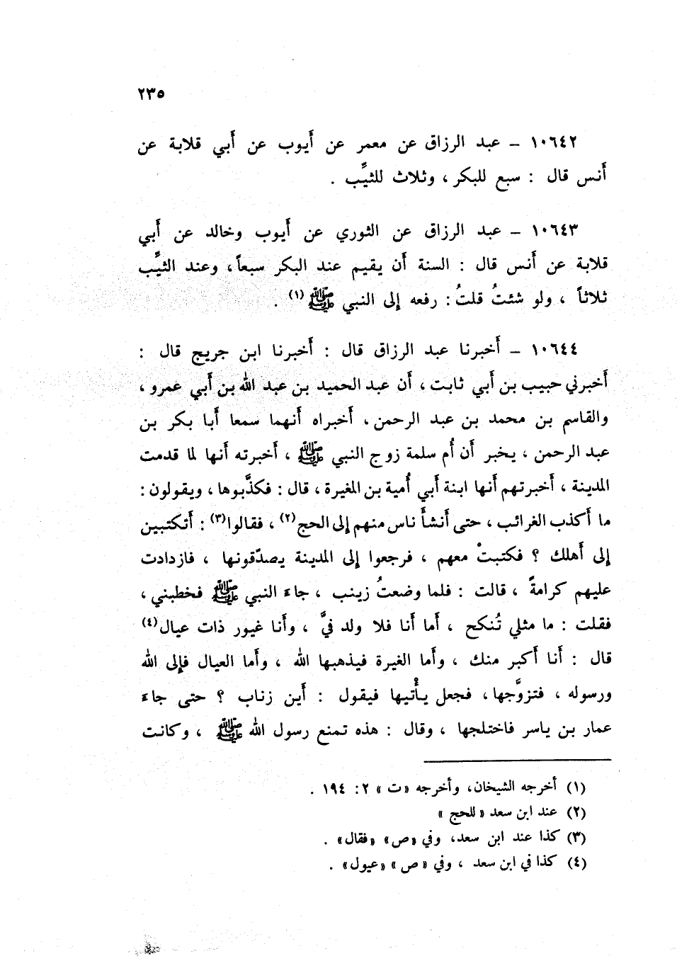 ١٠٦٤٤ - عَبْدُ الرَّزَّاقِ، أَخْبَرَنَا ابْنُ جُرَيْجٍ قَالَ: أَخْبَرَنِي حَبِيبُ بْنُ أَبِي ثَابِتٍ، أَنَّ عَبْدَ الْحَمِيدِ بْنَ عَبْدِ اللَّهِ بْنِ أَبِي عَمْرٍو، وَالْقَاسِمَ بْنَ مُحَمَّدِ بْنِ عَبْدِ الرَّحْمَنِ، أَخْبَرَاهُ أَنَّهُمَا سَمِعَا أَبَا بَكْرِ بْنَ عَبْدِ الرَّحْمَنِ: يُخْبِرُ أَنَّ أُمَّ سَلَمَةَ زَوْجَ النَّبِيِّ صَلَّى اللهُ عَلَيْهِ وَسَلَّمَ، أَخْبَرَتْهُ: أَنَّهَا لَمَّا قَدِمَتِ الْمَدِينَةَ، أَخْبَرَتْهُمْ أَنَّهَا ابْنَةُ أَبِي أُمَيَّةَ بْنِ الْمُغِيرَةِ قَالَ: فَكَذَّبُوهَا، وَيَقُولُونَ: مَا أَكْذَبَ الْغَرَائِبَ، حَتَّى أَنْشَأَ نَاسٌ مِنْهُمْ إِلَى الْحَجِّ فَقَالُوا: أَتَكْتُبِينَ إِلَى أَهْلِكِ؟ فَكَتَبَتْ مَعَهُمْ، فَرَجَعُوا إِلَى الْمَدِينَةِ يُصَدِّقُونَهَا، فَازْدَادَتْ عَلَيْهِمْ كَرَامَةً قَالَتْ: فَلَمَّا وَضَعْتُ زَيْنَبَ جَاءَ النَّبِيُّ صَلَّى اللهُ عَلَيْهِ وَسَلَّمَ فَخَطَبَنِي، فَقُلْتُ: مَا مِثْلِي تُنْكَحُ، أَمَّا أَنَا فَلَا وَلَدَ فِيَّ، وَأَنَا غَيُورٌ ذَاتُ عِيَالٍ قَالَ: «أَنَا أَكْبَرُ مِنْكِ، وَأَمَّا الْغَيْرَةُ فَيُذْهِبُهَا اللَّهُ، وَأَمَّا الْعِيَالُ فَإِلَى اللَّهِ وَرَسُولِهِ»، فَتَزَوَّجَهَا فَجَعَلَ يَأْتِيهَا، فَيَقُولُ: «أَيْنَ زُنَابُ»، حَتَّى جَاءَ عَمَّارُ بْنُ يَاسِرٍ فَاخْتَلَجَهَا قَالَ: هَذِهِ تَمْنَعُ رَسُولَ اللَّهِ صَلَّى اللهُ عَلَيْهِ وَسَلَّمَ، وَكَانَتْ ⦗٢٣٦⦘ تُرْضِعُهَا، فَجَاءَ النَّبِيُّ صَلَّى اللهُ عَلَيْهِ وَسَلَّمَ فَقَالَ: «أَيْنَ زُنَابُ؟»، فَقَالَتْ قَرِيبَةُ ابْنَةِ أَبِي أُمَيَّةَ وَوَافَقَهَا عِنْدَهَا: أَخَذَهَا عَمَّارُ بْنُ يَاسِرٍ، قَالَ النَّبِيُّ صَلَّى اللهُ عَلَيْهِ وَسَلَّمَ: «أَنَا آتِيكُمُ اللَّيْلَةَ» قَالَتْ: فَقُمْتُ فَوَضَعْتُ ثِفَالِي، وَأَخْرَجْتُ حَبَّاتٍ مِنْ شَعِيرٍ كَانَتْ فِي جَرَّتِي، وَأَخْرَجْتُ شَحْمًا فَعَصَدْتُ لَهُ قَالَتْ: فَبَاتَ النَّبِيُّ صَلَّى اللهُ عَلَيْهِ وَسَلَّمَ ثُمَّ أَصْبَحَ، فَقَالَ حِينَ أَصْبَحَ: «إِنَّ بِكِ عَلَى أَهْلِكَ كَرَامَةً، فَإِنْ شِئْتِ سَبَّعْتُ، وَإِنْ أُسَبِّعْ أُسَبِّعْ لِنِسَائِي»