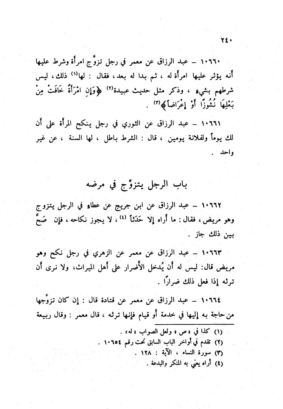 ١٠٦٦٣ - عَنْ مَعْمَرٍ، عَنِ الزُّهْرِيِّ: فِي رَجُلٍ نَكَحَ وَهُوَ مَرِيضٌ قَالَ: «لَيْسَ لَهُ أَنْ يُدْخِلَ الْأَضْرَارَ عَلَى أَهْلِ الْمِيرَاثِ، وَلَا نَرَى أَنْ تَرِثَهُ إِذَا فَعَلَ ذَلِكَ ضِرَارًا»