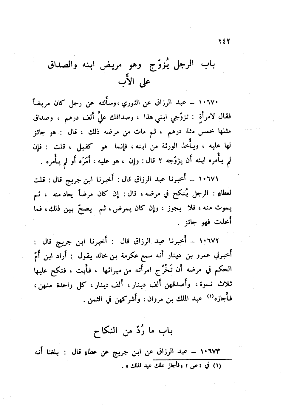 ١٠٦٧٢ - عَبْدُ الرَّزَّاقِ قَالَ: أَخْبَرَنَا ابْنُ جُرَيْجٍ قَالَ: أَخْبَرَنِي عَمْرُو بْنُ دِينَارٍ، أَنَّهُ سَمِعَ عِكْرِمَةَ بْنَ خَالِدٍ يَقُولُ: «أَرَادَ ابْنُ أُمِّ الْحَكَمِ فِي مَرَضِهِ أَنْ تَخْرُجَ امْرَأَتُهُ مِنْ مِيرَاثِهَا فَأَبَتْ، فَنَكَحَ عَلَيْهَا ثَلَاثَ نِسْوَةٍ، وَأَصْدَقَهُنَّ أَلْفَ دِينَارٍ، أَلْفَ دِينَارٍ، كُلَّ وَاحِدَةٍ مِنْهُنَّ، فَأَجَازَهُ عَبْدُ الْمَلِكِ بْنُ مَرْوَانَ، وَأَشْرَكَهُنَّ فِي الثُّمُنِ»