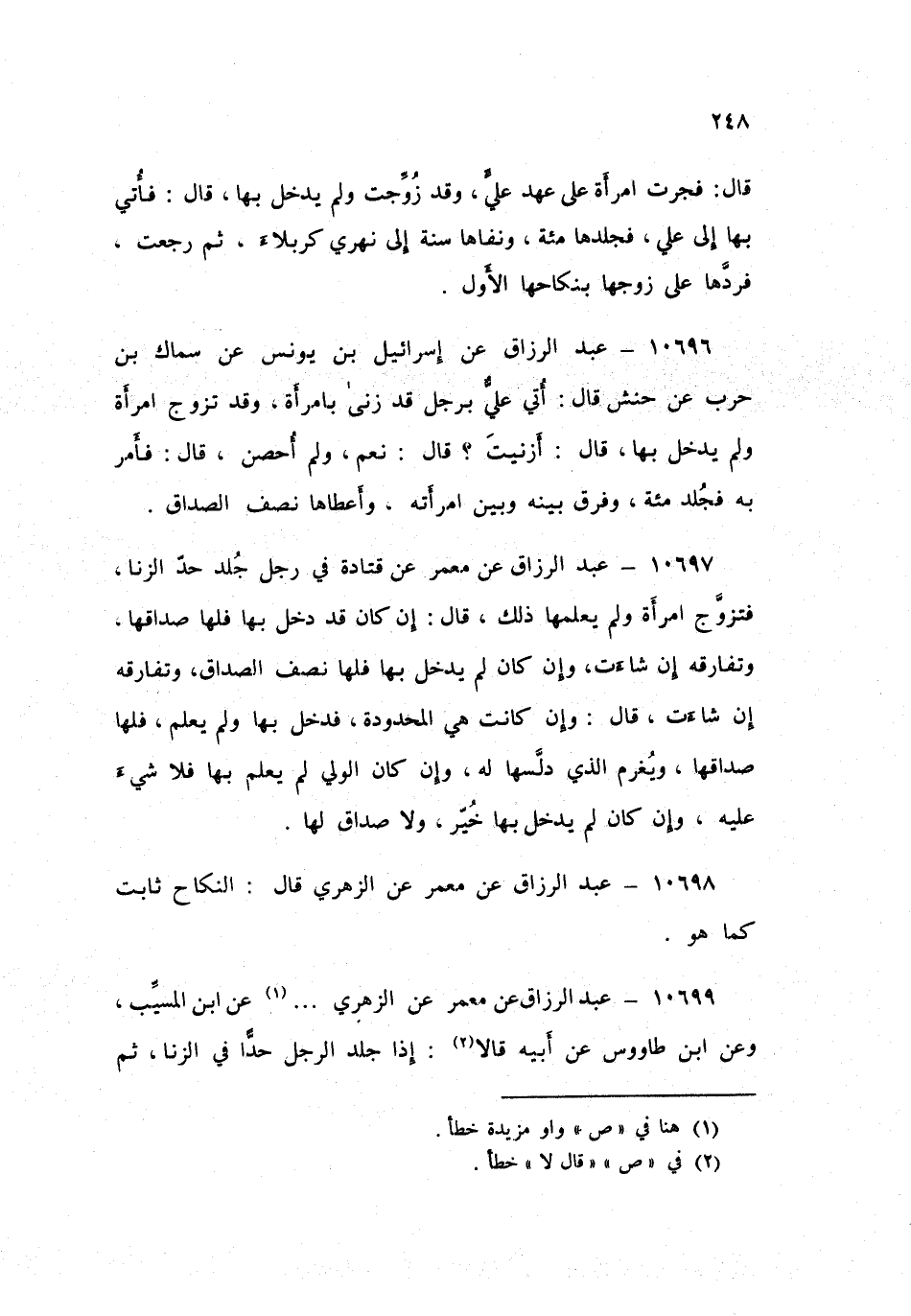 ١٠٦٩٩ - عَنْ مَعْمَرٍ، عَنِ الزُّهْرِيِّ، عَنِ ابْنِ الْمُسَيِّبِ، عَنِ ابْنِ طَاوُسٍ، عَنْ أَبِيهِ، قَالَا: «إِذَا جُلِدَ الرَّجُلُ حَدًّا فِي الزِّنَا، ثُمَّ تَزَوَّجَ فَإِنْ كَانَ قَدْ أُونِسَ مِنْهُ تَوْبَةٌ، فَهُمَا عَلَى نِكَاحِهِمَا»، قَالَ مَعْمَرٌ: «وَسَمِعْتُ مَنْ يَقُولُ يُرَدُّ مِنَ النِّكَاحِ مَا يُرَدُّ مِنَ الرِّقَابِ»