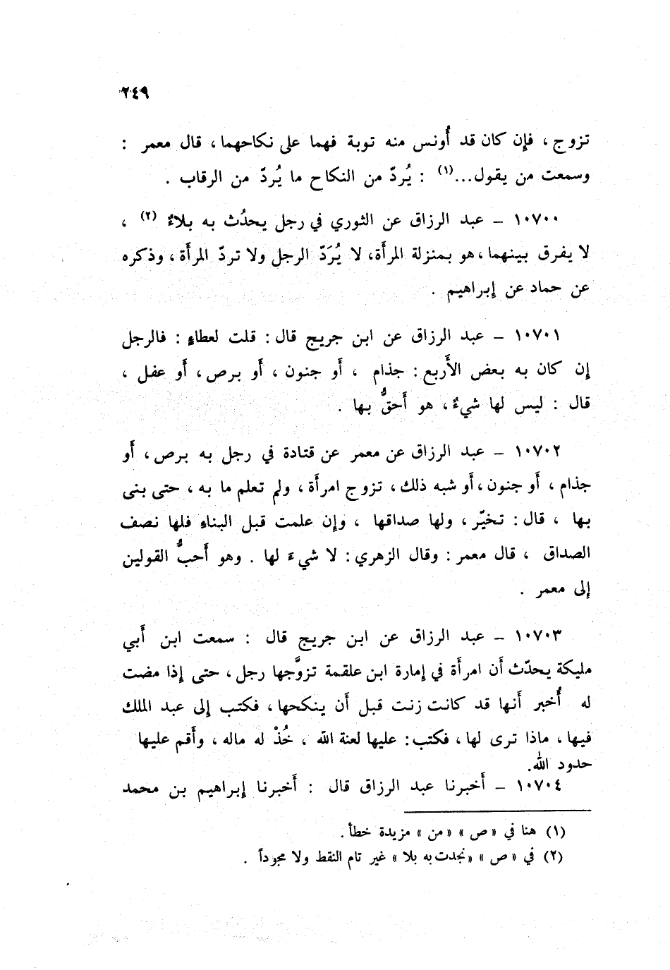 ١٠٧٠٤ - عَبْدُ الرَّزَّاقِ، أَخْبَرَنَا إِبْرَاهِيمُ بْنُ مُحَمَّدٍ، عَنْ صَفْوَانَ بْنِ سُلَيْمٍ، عَنْ سَعِيدِ بْنِ الْمُسَيِّبِ، عَنْ رَجُلٍ مِنَ الْأَنْصَارِ يُقَالُ لَهُ: بُصْرَةُ قَالَ: تَزَوَّجْتُ امْرَأَةً بِكْرًا فَدَخَلْتُ عَلَيْهَا، فَإِذَا هِيَ حُبْلَى، فَقَالَ النَّبِيُّ صَلَّى اللهُ عَلَيْهِ وَسَلَّمَ: «لَهَا الصَّدَاقُ بِمَا اسْتَحَلَّ مِنْ فَرْجِهَا، وَالْوَلَدُ عَبْدٌ لَكَ، فَإِذَا وَلَدَتْ فَاجْلِدْهَا». عَبْدُ الرَّزَّاقِ،