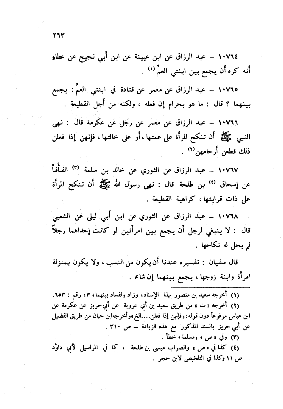 ١٠٧٦٨ - عَنِ الثَّوْرِيِّ، عَنِ ابْنِ أَبِي لَيْلَى، عَنِ الشَّعْبِيِّ قَالَ: «لَا يَنْبَغِي لِرَجُلٍ أَنْ يَجْمَعَ بَيْنَ امْرَأَتَيْنِ، لَوْ كَانَتْ إِحْدَاهُمَا رَجُلًا لَمْ يَحِلَّ لَهُ نِكَاحُهَا»، قَالَ سُفْيَانُ: «تَفْسِيرُهُ عِنْدَنَا أَنْ يَكُونَ مِنَ النَّسَبِ، وَلَا يَكُونُ بِمَنْزِلَةِ امْرَأَةٍ وَابْنَةِ زَوْجِهَا يَجْمَعُ بَيْنَهُمَا إِنْ شَاءَ»