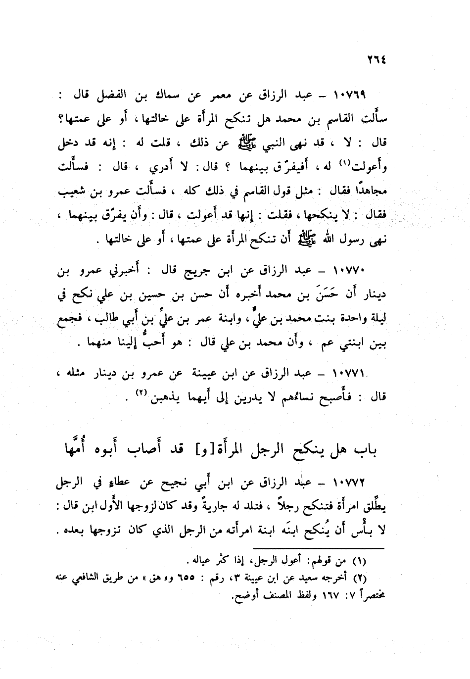 ١٠٧٧٠ - عَنِ ابْنِ جُرَيْجٍ قَالَ: أَخْبَرَنِي عَمْرُو بْنُ دِينَارٍ، أَنَّ حَسَنَ بْنَ مُحَمَّدٍ، أَخْبَرَهُ: أَنَّ حَسَنَ بْنَ حُسَيْنِ بْنِ عَلِيٍّ نَكَحَ فِي لَيْلَةٍ وَاحِدَةٍ بِنْتَ مُحَمَّدِ بْنِ عَلِيٍّ، وَابْنَةَ عُمَرَ بْنِ عَلِيِّ بْنِ أَبِي طَالِبٍ فَجَمَعَ بَيْنَ ابْنَتَيْ عَمٍّ، وَأَنَّ مُحَمَّدَ بْنَ عَلِيٍّ قَالَ: «هُوَ أَحَبُّ إِلَيْنَا مِنْهُمَا». عَبْدِ الرَّزَّاقِ،