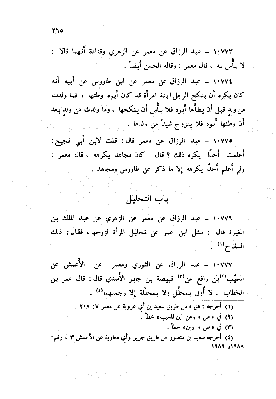 ١٠٧٧٥ - عَنْ مَعْمَرٍ قَالَ: قُلْتُ لَابنِ أَبِي نَجِيحٍ: أَعَلِمْتَ أَحَدًا يَكْرَهُ ذَلِكَ؟ قَالَ: كَانَ مُجَاهِدٌ يَكْرَهُهُ "، قَالَ مَعْمَرٌ: «وَلَمْ أَعْلَمْ أَحَدًا يَكْرَهُهُ إِلَّا مَا ذُكِرَ، عَنْ طَاوُسٍ، وَمُجَاهِدٍ»