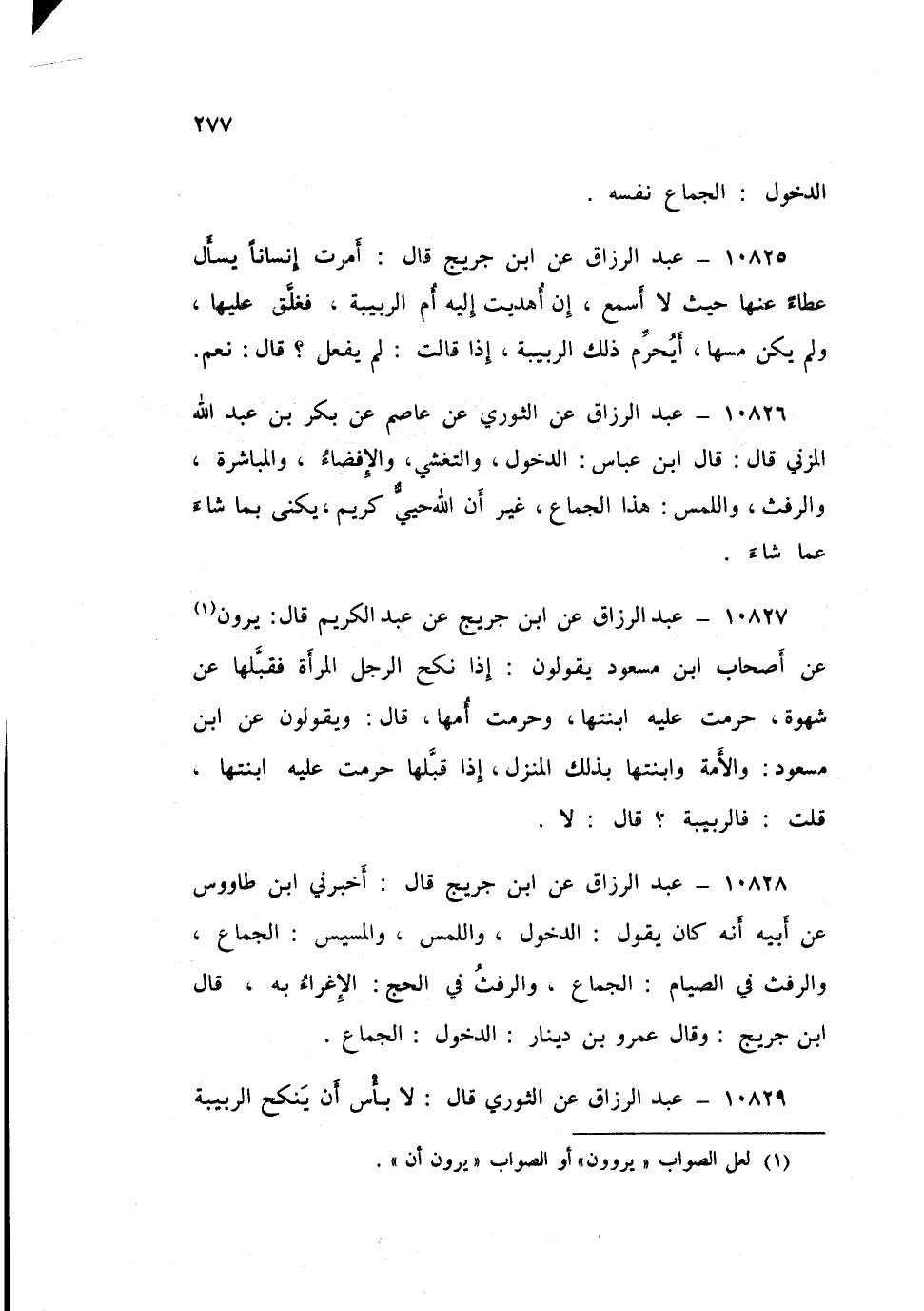 ١٠٨٢٧ - عَنِ ابْنِ جُرَيْجٍ، عَنْ عَبْدِ الْكَرِيمِ قَالَ: يَرْوُونَ عَنْ أَصْحَابِ ابْنِ مَسْعُودٍ، يَقُولُونَ: «إِذَا نَكَحَ الرَّجُلُ الْمَرْأَةَ فَقَبَّلَهَا عَنْ شَهْوَةٍ، حُرِّمَتْ عَلَيْهِ ابْنَتُهَا، وَحُرِّمَتْ أُمُّهَا». قَالَ: وَيَقُولُونَ عَنِ ابْنِ مَسْعُودٍ: " وَالْأَمَةُ وَابْنَتُهَا بِذَلِكَ الْمَنْزِلِ، إِذَا قَبَّلَهَا حُرِّمَتْ عَلَيْهِ ابْنَتُهَا، قُلْتُ: فَالرَّبِيبَةُ؟ قَالَ: «لَا»