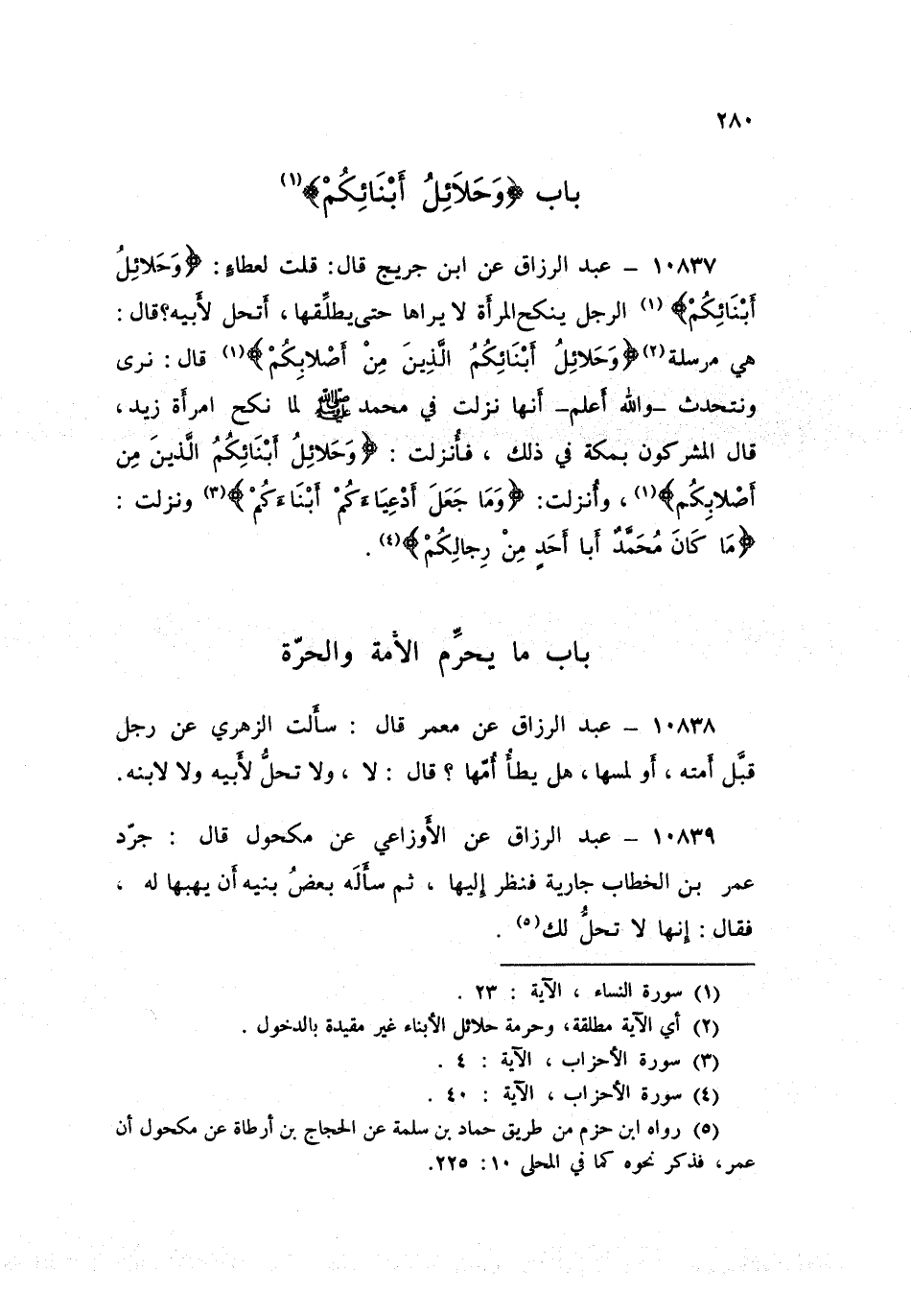 ١٠٨٣٧ - عَنِ ابْنِ جُرَيْجٍ قَالَ: قُلْتُ لِعَطَاءٍ: {وَحَلَائِلُ أَبْنَائِكُمُ} [النساء: ٢٣]، الرَّجُلُ يَنْكِحُ الْمَرْأَةَ لَا يَرَاهَا حَتَّى يُطَلِّقَهَا، أَتَحِلُّ لِأَبِيهِ؟ قَالَ: هِيَ مُرْسَلَةٌ {وَحَلَائِلُ أَبْنَائِكُمُ الَّذِينَ مِنْ أَصْلَابِكُمْ} [النساء: ٢٣] قَالَ: نَرَى وَنَتَحَدَّثُ، وَاللَّهُ أَعْلَمُ أَنَّهَا نَزَلَتْ فِي مُحَمَّدٍ صَلَّى اللهُ عَلَيْهِ وَسَلَّمَ لَمَّا نَكَحَ امْرَأَةَ زَيْدٍ، قَالَ الْمُشْرِكُونَ بِمَكَّةَ فِي ذَلِكَ، فَأُنْزِلَتْ {وَحَلَائِلُ أَبْنَائِكُمُ الَّذِينَ مِنْ أَصْلَابِكُمْ} [النساء: ٢٣]، وَأُنْزِلَتْ: {وَمَا جَعَلَ أَدْعِيَاءَكُمْ أَبْنَاءَكُمْ} [الأحزاب: ٤]، وَنَزَلَتْ {مَا كَانَ مُحَمَّدٌ أَبَا أَحَدٍ مِنْ رِجَالِكُمْ} [الأحزاب: ٤٠]