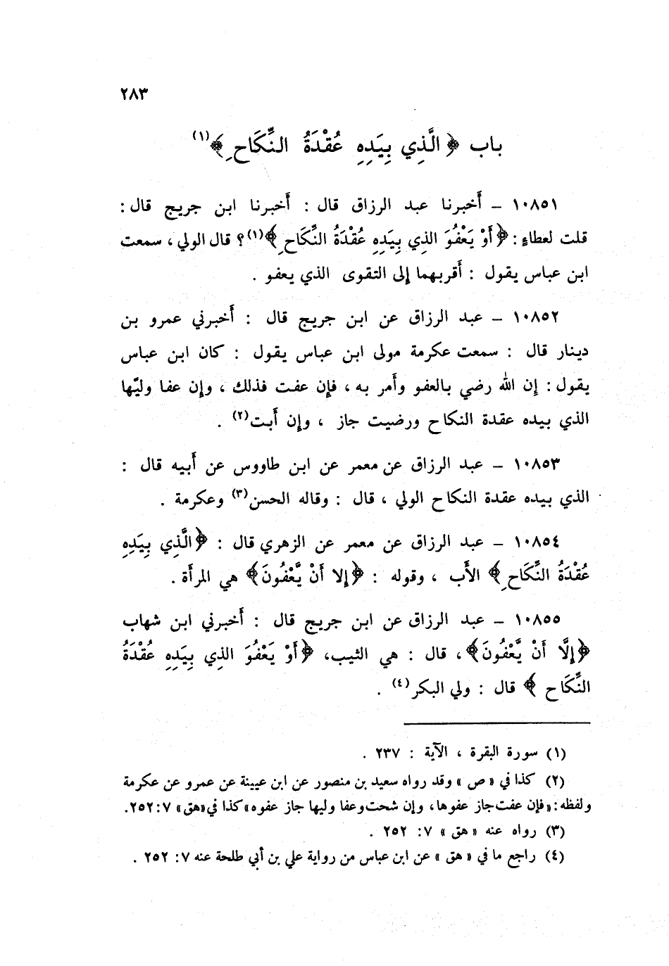 ١٠٨٥٥ - عَنِ ابْنِ جُرَيْجٍ قَالَ: أَخْبَرَنِي ابْنُ شِهَابٍ، {إِلَّا أَنْ يَعْفُونَ} [البقرة: ٢٣٧] قَالَ: " هِيَ الثَّيِّبُ، {أَوْ يَعْفُوَ الَّذِي بِيَدِهِ عُقْدَةُ النِّكَاحِ} [البقرة: ٢٣٧] قَالَ: «وَلِيُّ الْبِكْرِ»