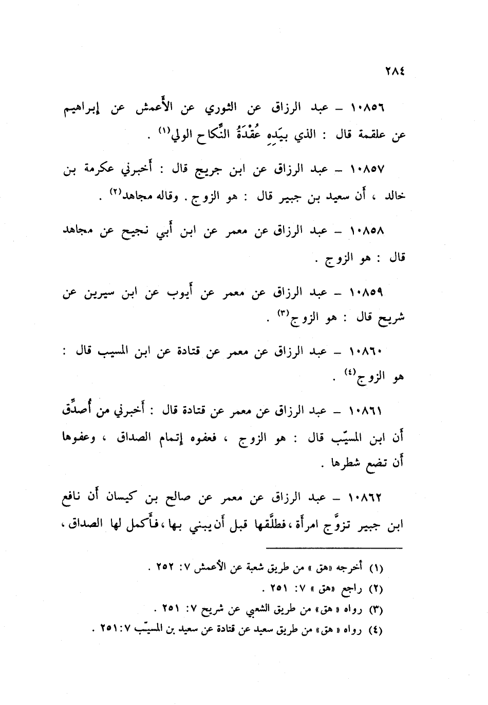 ١٠٨٦٢ - عَنْ مَعْمَرٍ، عَنْ صَالِحِ بْنِ كَيْسَانَ، أَنَّ نَافِعَ بْنَ جُبَيْرٍ " تَزَوَّجَ امْرَأَةً فَطَلَّقَهَا قَبْلَ أَنْ يَبْنِيَ بِهَا، فَأَكْمَلَ لَهَا الصَّدَاقَ، وَتَأَوَّلَ {الَّذِي بِيَدِهِ عُقْدَةَ النِّكَاحِ} [البقرة: ٢٣٧] يَعْنِي الزَّوْجَ "، قَالَ مَعْمَرٌ: {إِلَّا أَنْ يَعْفُونَ} [البقرة: ٢٣٧]: يَعْنِي النِّسَاءَ فِي قَوْلِ كُلِّهِمْ، مَنْ قَالَ: " هُوَ الزَّوْجُ، وَمَنْ قَالَ: هُوَ الْوَلِيُّ، وَيَقُولُونَ: يَعْفُونَ فَيَتْرُكْنَ الصَّدَاقَ "