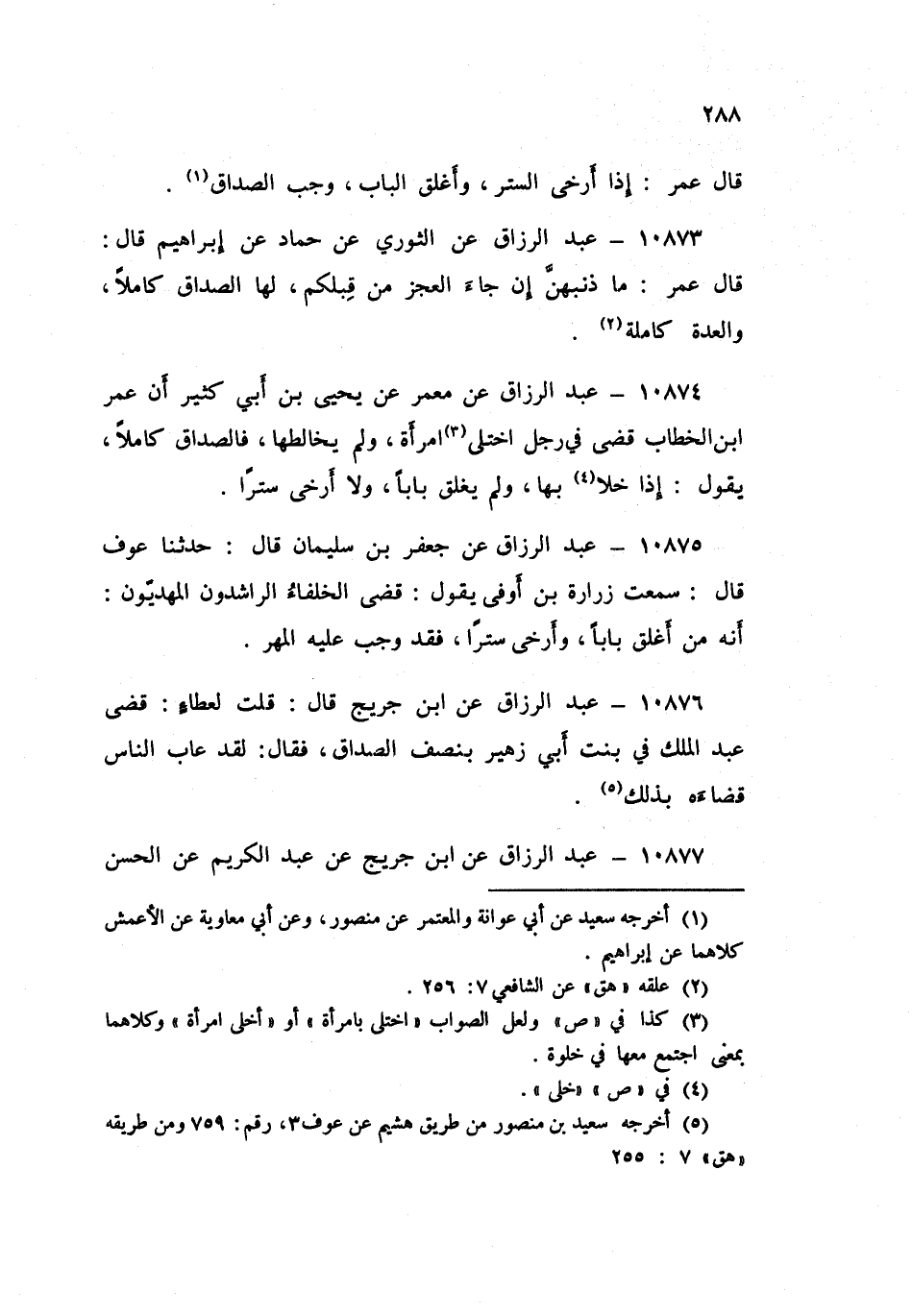 ١٠٨٧٤ - عَنْ مَعْمَرٍ، عَنْ يَحْيَى بْنِ أَبِي كَثِيرٍ، أَنَّ عُمَرَ بْنَ الْخَطَّابِ قَضَى فِي رَجُلٍ اخْتَلَى بِامْرَأَةٍ وَلَمْ يُخَالِطْهَا، فَالصَّدَاقُ كَامِلًا يَقُولُ: «إِذَا خَلَا بِهَا وَلَمْ يُغْلِقْ بَابًا، وَلَا أَرْخَى سِتْرًا»