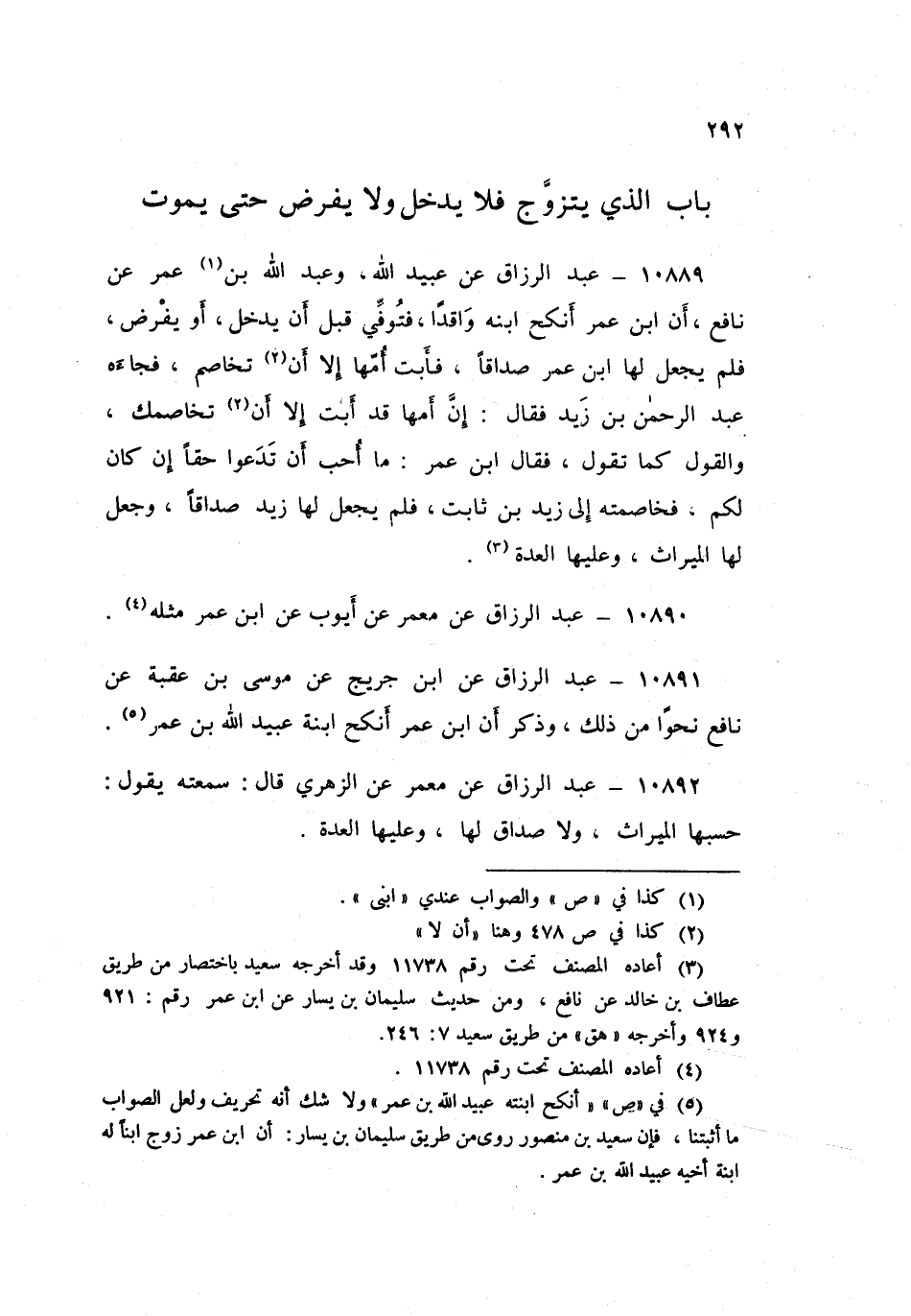 ١٠٨٨٩ - عَنْ عُبَيْدِ اللَّهِ، وَعَبْدِ اللَّهِ ابْنَيْ عُمَرَ، عَنْ نَافِعٍ أَنَّ ابْنَ عُمَرَ أَنْكَحَ ابْنَهُ وَاقِدًا فَتُوُفِّيَ قَبْلَ أَنْ يَدْخُلَ أَوْ يَفْرِضَ، فَلَمْ يَجْعَلْ لَهَا ابْنُ عُمَرَ صَدَاقًا، فَأَبَتْ أُمُّهَا إِلَّا أَنْ تُخَاصِمَ، فَجَاءَهُ عَبْدُ الرَّحْمَنِ بْنُ زَيْدٍ، فَقَالَ: إِنَّ أُمَّهَا قَدْ أَبَتْ إِلَّا أَنْ تُخَاصِمَكَ، وَالْقَوْلُ كَمَا تَقُولُ، فَقَالَ ابْنُ عُمَرَ: «مَا أُحِبُّ أَنْ تَدَعُوا حَقًّا إِنْ كَانَ لَكُمْ»، فَخَاصَمَتْهُ إِلَى زَيْدِ بْنِ ثَابِتٍ فَلَمْ يَجْعَلْ لَهَا زَيْدٌ صَدَاقًا، وَجَعَلَ لَهَا الْمِيرَاثَ، وَعَلَيْهَا الْعِدَّةُ. عَبْدُ الرَّزَّاقِ،