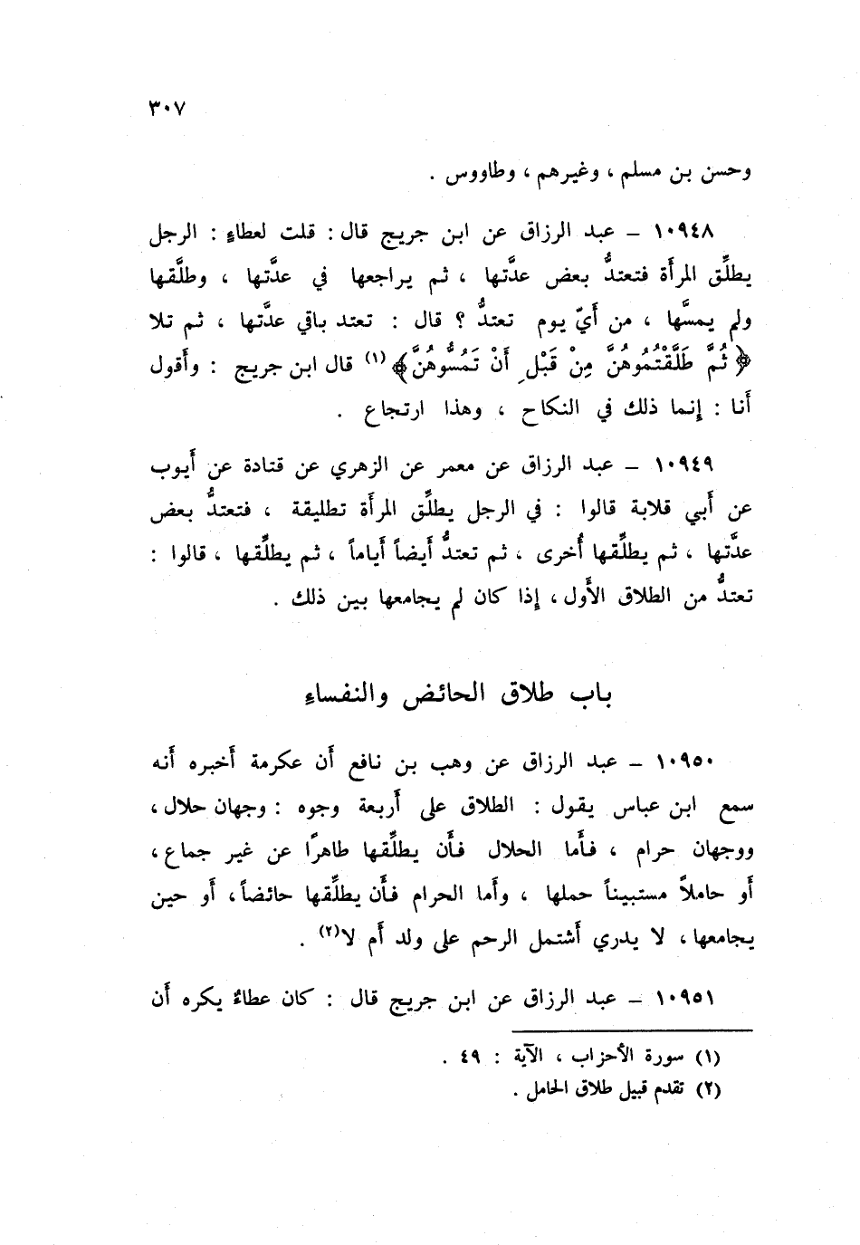 ١٠٩٥١ - عَنِ ابْنِ جُرَيْجٍ قَالَ: «كَانَ عَطَاءٌ يَكْرَهُ أَنْ يُطَلِّقَ الرَّجُلُ امْرَأَتَهُ حَائِضًا، كَمَا يَكْرَهُ أَنْ يُطَلِّقَهَا نُفَسَاءَ»