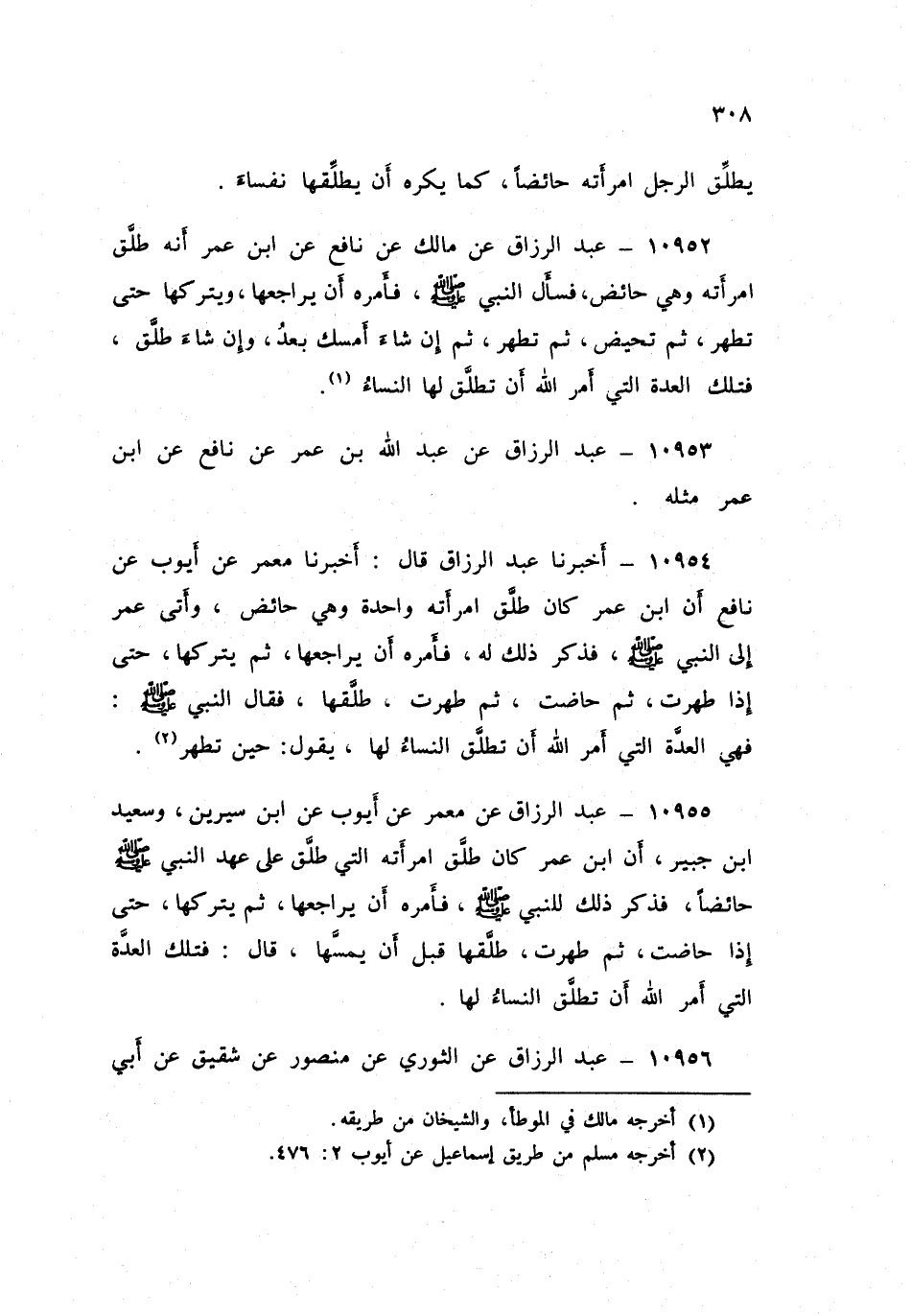 ١٠٩٥٧ - عَنِ ابْنِ جُرَيْجٍ قَالَ: أَرْسَلْنَا إِلَى نَافِعٍ وَهُوَ يَتَرَجَّلُ فِي دَارِ النَّدْوَةِ ذَاهِبًا إِلَى الْمَدِينَةِ، وَنَحْنُ جُلُوسٌ مَعَ عَطَاءٍ: أَمْ حُسِبَتْ تَطْلِيقَةُ عَبْدِ اللَّهِ امْرَأَتَهُ حَائِضًا عَلَى عَهْدِ النَّبِيِّ صَلَّى اللهُ عَلَيْهِ وَسَلَّمَ وَاحِدَةً؟ قَالَ: «نَعَمْ»