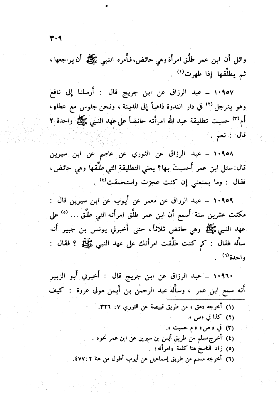 ١٠٩٦٠ - عَنِ ابْنِ جُرَيْجٍ قَالَ: أَخْبَرَنِي أَبُو الزُّبَيْرِ أَنَّهُ سَمِعَ ابْنَ عُمَرَ، وَسَأَلَهُ عَبْدُ الرَّحْمَنِ بْنُ أَيْمَنَ مَوْلَى عُرْوَةَ، كَيْفَ تَرَى فِي رَجُلٍ طَلَّقَ امْرَأَتَهُ حَائِضًا؟ فَقَالَ: طَلَّقَ عَبْدُ اللَّهِ بْنُ عُمَرَ امْرَأَتَهُ وَهِيَ حَائِضٌ عَلَى عَهْدِ النَّبِيِّ صَلَّى اللهُ عَلَيْهِ وَسَلَّمَ، فَسَأَلَ عُمَرُ النَّبِيَّ صَلَّى اللهُ عَلَيْهِ وَسَلَّمَ، فَقَالَ النَّبِيُّ صَلَّى اللهُ عَلَيْهِ وَسَلَّمَ: «فَلْيُرَاجِعْهَا»، فَرَدَّهَا وَلَمْ يَرَهَا شَيْئًا، فَقَالَ: «إِذَا طَهُرَتْ فَلْيُطَلِّقْ، أَوْ لِيُمْسِكْ»، قَالَ ابْنُ عُمَرَ: وَقَرَأَ النَّبِيُّ صَلَّى اللهُ عَلَيْهِ وَسَلَّمَ: «يَا أَيُّهَا الَّذِينَ آمَنُوا إِذَا طَلَّقْتُمُ النِّسَاءَ فَطَلِّقُوهُنَّ لِعِدَّتِهِنَّ فِي قُبُلِ عِدَّتِهِنَّ»