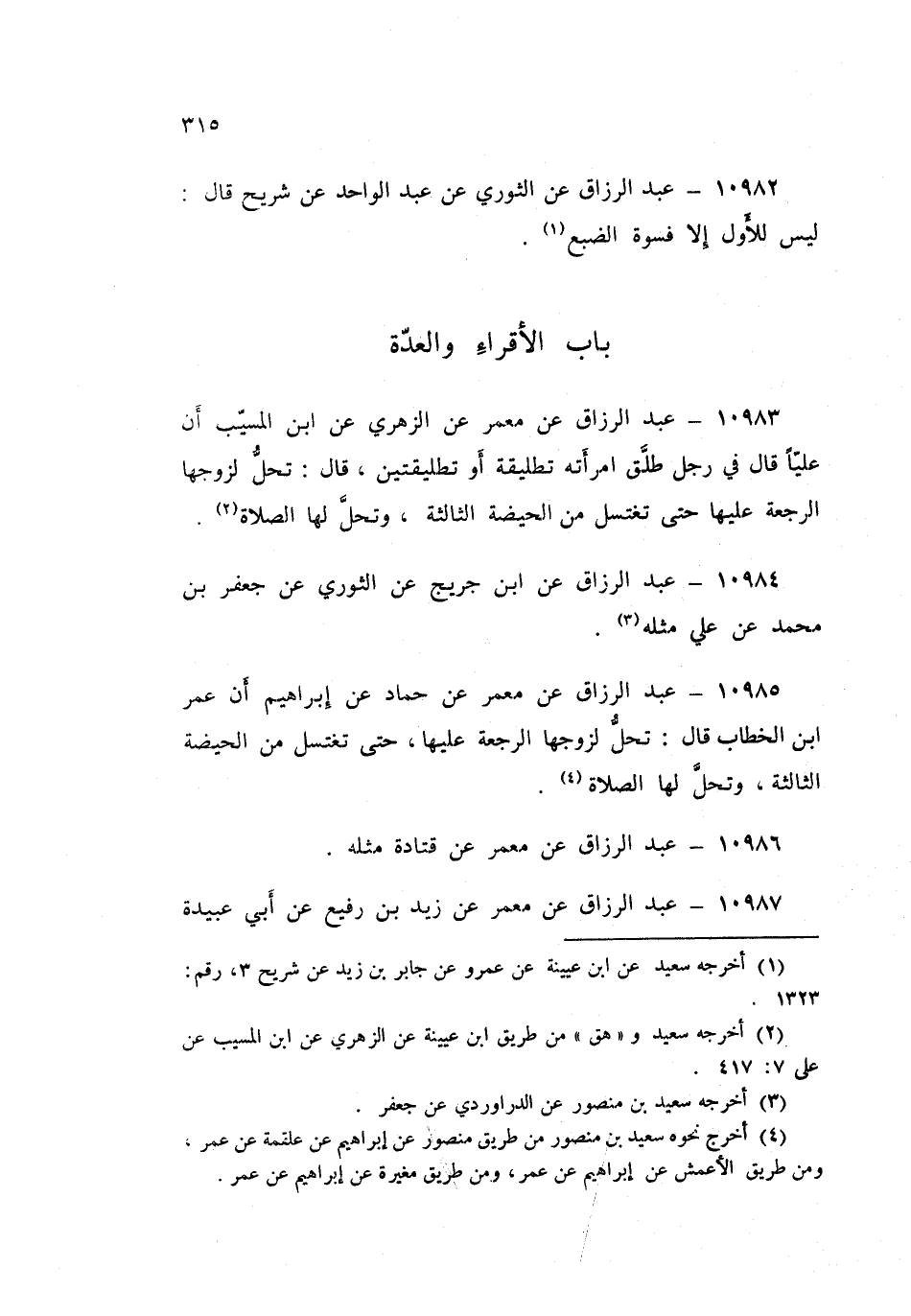 ١٠٩٨٧ - عَنْ مَعْمَرٍ، عَنْ زَيْدِ بْنِ رُفَيْعٍ، عَنْ أَبِي عُبَيْدَةَ بْنِ عَبْدِ اللَّهِ بْنِ مَسْعُودٍ قَالَ: أَرْسَلَ عُثْمَانُ بْنُ عَفَّانَ إِلَى أَبِي يَسْأَلُهُ عَنْهَا، فَقَالَ أَبِي: «كَيْفَ يُفْتِي مُنَافِقٌ؟» فَقَالَ عُثْمَانُ: نُعِيذُكُ بِاللَّهِ أَنْ تَكُونَ مُنَافِقًا، وَنُعَوِّذُكَ بِاللَّهِ أَنْ نُسَمِّيَكَ مُنَافِقًا، وَنَعُوذُكَ بِاللَّهِ أَنْ يَكُونَ مِنْكَ كَائِنٌ فِي الْإِسْلَامِ، ثُمَّ تَمُوتَ وَلَمْ تُبَيِّنْهُ قَالَ: «فَإِنِّي أَرَى أَنَّهُ أَحَقُّ بِهَا حَتَّى تَغْتَسِلَ مِنْ آخِرِ الْحَيْضَةِ الثَّالِثَةِ، وَتَحِلُّ لَهَا الصَّلَاةُ» قَالَ: فَلَا أَعْلَمُ عُثْمَانَ إِلَّا أَخَذَ بِذَلِكَ