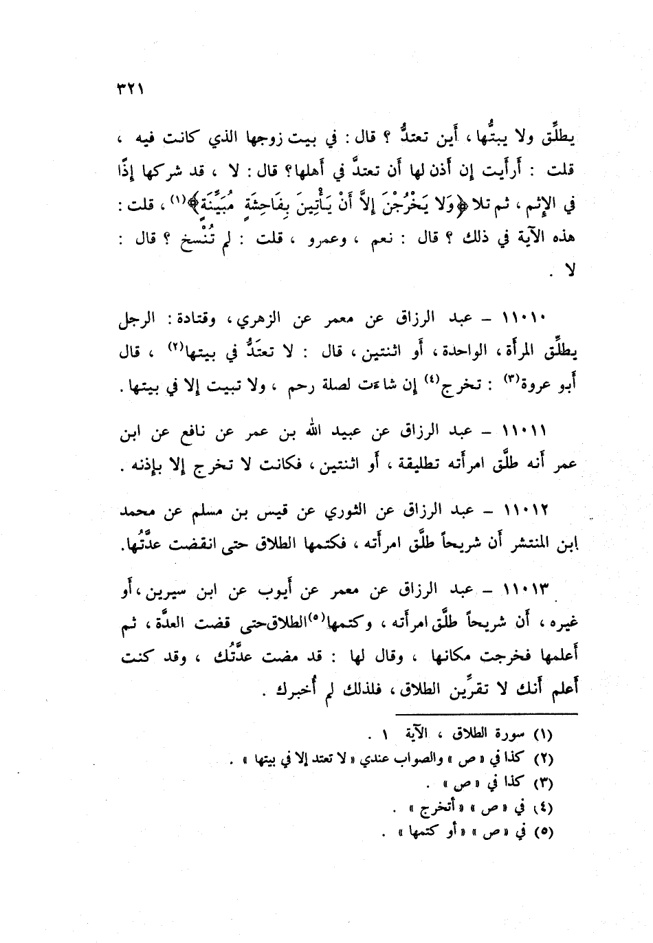 ١١٠١١ - عَنْ عُبَيْدِ اللَّهِ بْنِ عُمَرَ، عَنْ نَافِعٍ، عَنِ ابْنِ عُمَرَ «أَنَّهُ طَلَّقَ امْرَأَتَهُ تَطْلِيقَةً، أَوِ اثْنَتَيْنِ فَكَانَتْ لَا تَخْرُجُ إِلَّا بِإِذْنِهِ»
