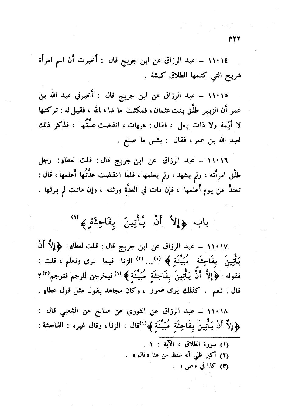 ١١٠١٩ - عَنِ ابْنِ جُرَيْجٍ قَالَ: أُخْبِرْتُ أَنَّ ابْنَ عُمَرَ قَالَ: «خُرُوجُهَا مِنْ بَيْتِ زَوْجِهَا قَبْلَ أَنْ تَنْقَضِيَ عِدَّتُهَا الْفَاحِشَةُ الْمُبَيِّنَةُ»