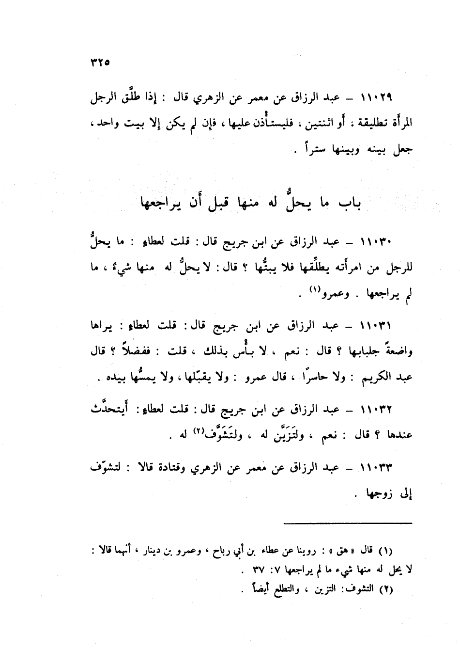 ١١٠٣٠ - عَنِ ابْنِ جُرَيْجٍ قَالَ: قُلْتُ لِعَطَاءٍ: مَا يَحِلُّ لِلرَّجُلِ مِنِ امْرَأَتِهِ يُطَلِّقُهَا فَلَا يَبُتُّهَا؟ قَالَ: «لَا يَحِلُّ لَهُ مِنْهَا شَيْءٌ مَا لَمْ يُرَاجِعْهَا». وَعَمْرٌو