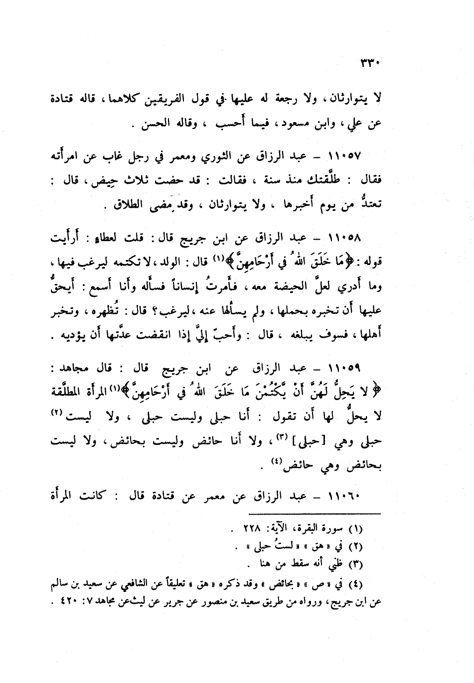 ١١٠٥٩ - عَنِ ابْنِ جُرَيْجٍ قَالَ: قَالَ مُجَاهِدٌ: {لَا يَحِلُّ لَهُنَّ أَنْ يَكْتُمْنَ مَا خَلَقَ اللَّهُ فِي أَرْحَامِهِنَّ} [البقرة: ٢٢٨]: " الْمَرْأَةُ الْمُطَلَّقَةُ لَا يَحِلُّ لَهَا أَنْ تَقُولَ: أَنَا حُبْلَى وَلَيْسَتْ حُبْلَى، وَلَا لَسْتُ حُبْلَى وَهِيَ حُبْلَى، وَلَا أَنَا حَائِضٌ وَلَيْسَتْ بِحَائِضٍ، وَلَا لَسْتُ بِحَائِضٍ وَهِيَ حَائِضٌ "