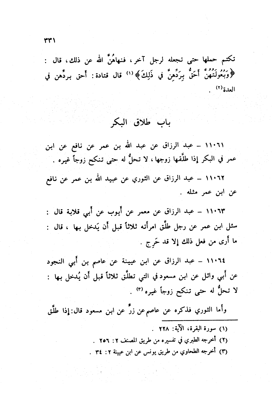 ١١٠٦١ - عَنْ عَبْدِ اللَّهِ بْنِ عُمَرَ، عَنْ نَافِعٍ، عَنِ ابْنِ عُمَرَ " فِي الْبِكْرِ إِذَا طَلَّقَهَا زَوْجُهَا: لَا تَحِلُّ لَهُ حَتَّى تَنْكِحَ زَوْجًا غَيْرَهُ ". عَبْدُ الرَّزَّاقِ،