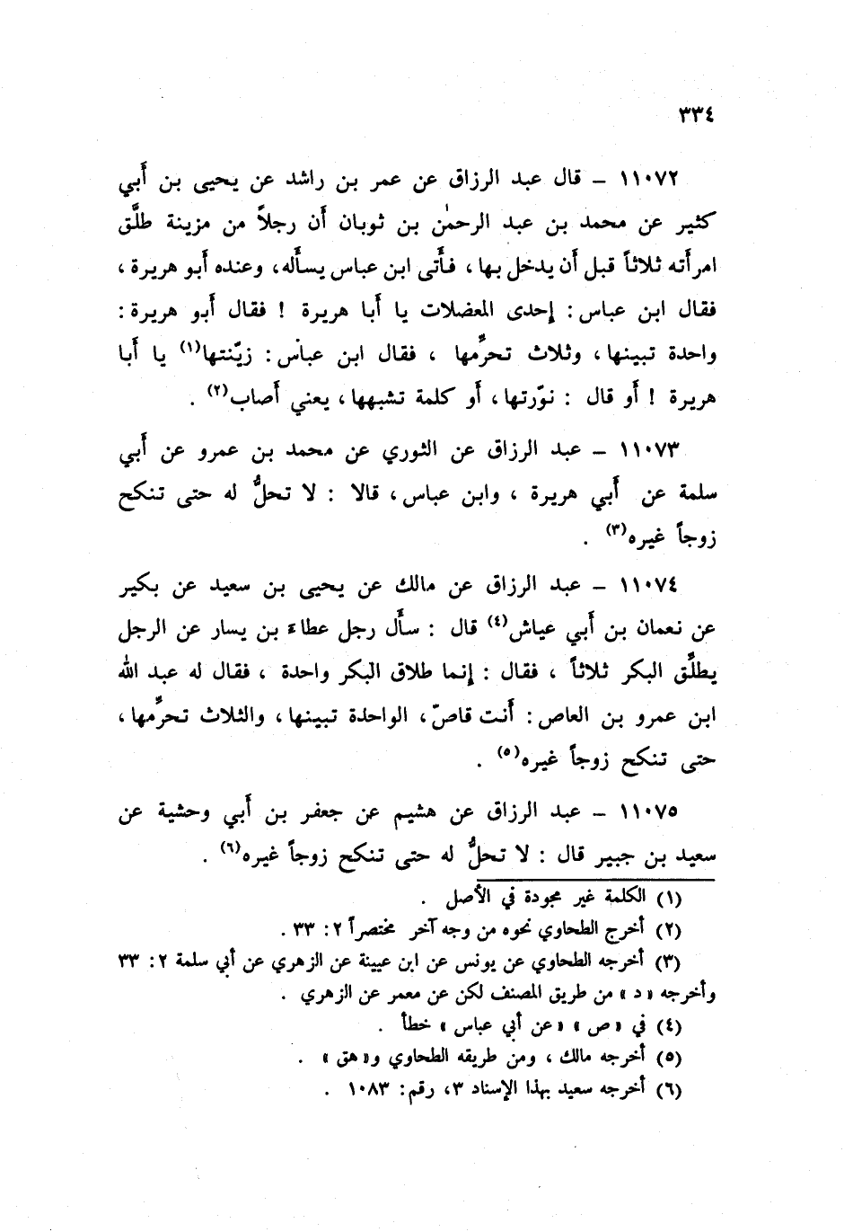 ١١٠٧٢ - عَبْد ُ الرَّزَّاقِ، عَنْ عُمَرَ بْنِ رَاشِدٍ، عَنْ يَحْيَى بْنِ أَبِي كَثِيرٍ، عَنْ مُحَمَّدِ بْنِ عَبْدِ الرَّحْمَنِ بْنِ ثَوْبَانَ أَنَّ رَجُلًا مِنْ مُزَيْنَةَ طَلَّقَ امْرَأَتَهُ ثَلَاثًا قَبْلَ أَنْ يَدْخُلَ بِهَا فَأَتَى ابْنَ عَبَّاسٍ يَسْأَلُهُ، وَعِنْدَهُ أَبُو هُرَيْرَةَ، فَقَالَ ابْنُ عَبَّاسٍ: «إِحْدَى الْمُعْضَلَاتِ يَا أَبَا هُرَيْرَةَ»، فَقَالَ أَبُو هُرَيْرَةَ: «وَاحِدَةٌ تُبِينُهَا، وَثَلَاثٌ تُحَرِّمُهَا»، فَقَالَ ابْنُ عَبَّاسٍ: «زَيَّنْتَهَا يَا أَبَا هُرَيْرَةَ»، أَوْ قَالَ: «نَوَّرْتَهَا»، أَوْ كَلِمَةً تُشْبِهُهَا. يَعْنِي: أَصَابَ