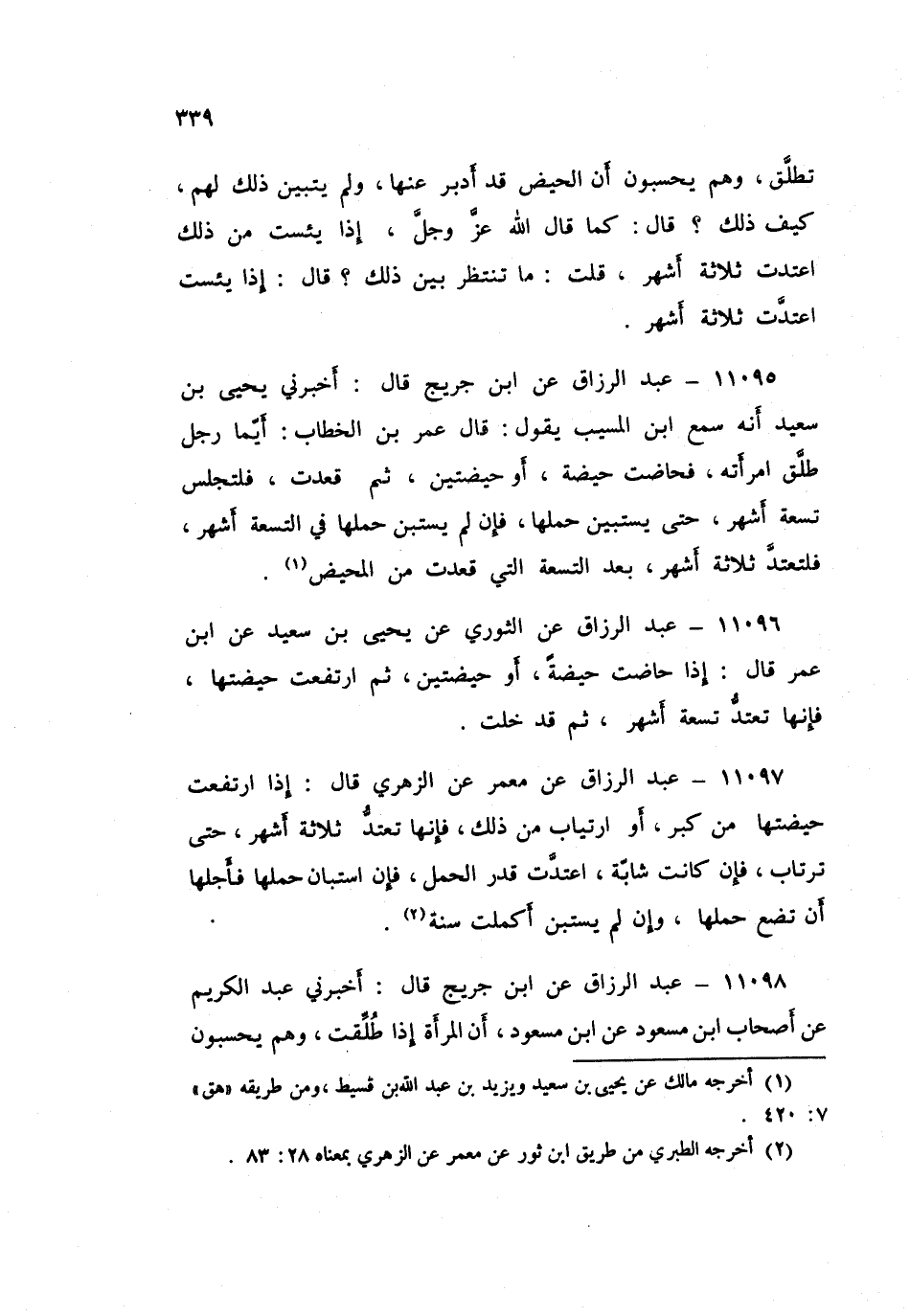 ١١٠٩٦ - عَنِ الثَّوْرِيِّ، عَنْ يَحْيَى بْنِ سَعِيدٍ، عَنِ ابْنِ عُمَرَ قَالَ: «إِذَا حَاضَتْ حَيْضَةً أَوْ حَيْضَتَيْنِ، ثُمَّ ارْتَفَعَتْ حَيْضَتُهَا فَإِنَّهَا تَعْتَدُّ تِسْعَةَ أَشْهُرٍ، ثُمَّ قَدْ خَلَتْ»