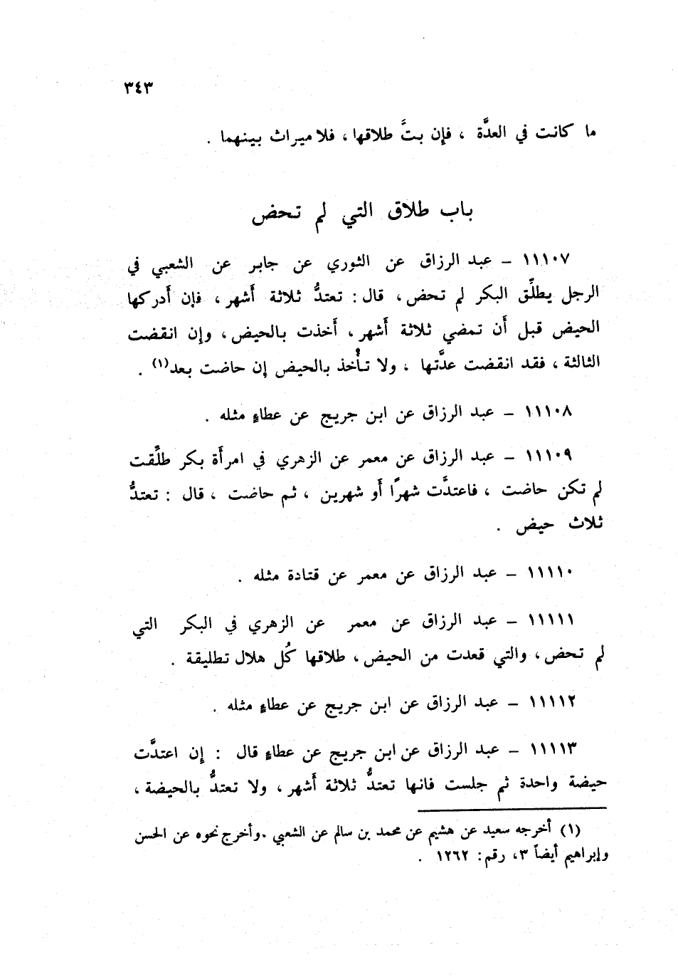 ١١١٠٧ - عَنِ الثَّوْرِيِّ، عَنْ جَابِرٍ، عَنِ الشَّعْبِيِّ فِي الرَّجُلِ يُطَلِّقُ الْبِكْرَ لَمْ تَحِضْ قَالَ: «تَعْتَدُّ ثَلَاثَةَ أَشْهُرٍ، فَإِنْ أَدْرَكَهَا الْحَيْضُ قَبْلَ أَنْ تَمْضِيَ ثَلَاثَةُ أَشْهُرٍ أَخَذَتْ بِالْحَيْضِ، وَإِنِ انْقَضَتِ الثَّالِثَةُ فَقَدِ انْقَضَتْ عِدَّتُهَا، وَلَا تَأْخُذْ بِالْحَيْضِ إِنْ حَاضَتْ بَعْدُ». عَبْدُ الرَّزَّاقِ،