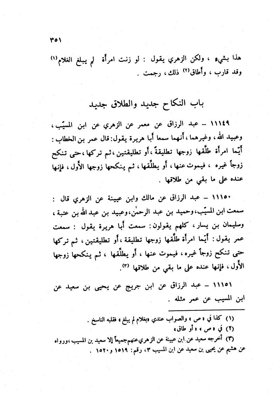 ١١١٥١ - عَبْدُ الرَّزَّاقِ، عَنْ مَالِكٍ، وَابْنِ عُيَيْنَةَ، عَنِ الزُّهْرِيِّ قَالَ: سَمِعْتُ ابْنَ الْمُسَيِّبِ، وَحُمَيْدَ بْنَ عَبْدِ الرَّحْمَنِ، وَعُبَيْدَ بْنَ عَبْدِ اللَّهِ بْنِ عُتْبَةَ، وَسُلَيْمَانَ بْنَ يَسَارٍ، كُلُّهُمْ يَقُولُونَ: سَمِعْتُ أَبَا هُرَيْرَةَ يَقُولُ: سَمِعْتُ عُمَرَ يَقُولُ: «أَيُّمَا امْرَأَةٍ طَلَّقَهَا زَوْجُهَا تَطْلِيقَةً، أَوْ تَطْلِيقَتَيْنِ، ثُمَّ تَرَكَهَا حَتَّى تَنْكِحَ زَوْجًا غَيْرَهُ فَيَمُوتُ عَنْهَا، أَوْ يُطَلِّقَهَا، ثُمَّ يَنْكِحُهَا زَوْجُهَا الْأَوَّلُ، فَإِنَّهَا عِنْدَهُ عَلَى مَا بَقِيَ مِنْ طَلَاقِهَا». عَبْدُ الرَّزَّاقِ، عَنِ ابْنِ جُرَيْجٍ، عَنْ يَحْيَى بْنِ سَعِيدٍ، عَنِ ابْنِ الْمُسَيِّبِ، عَنْ عُمَرَ مِثْلَهُ