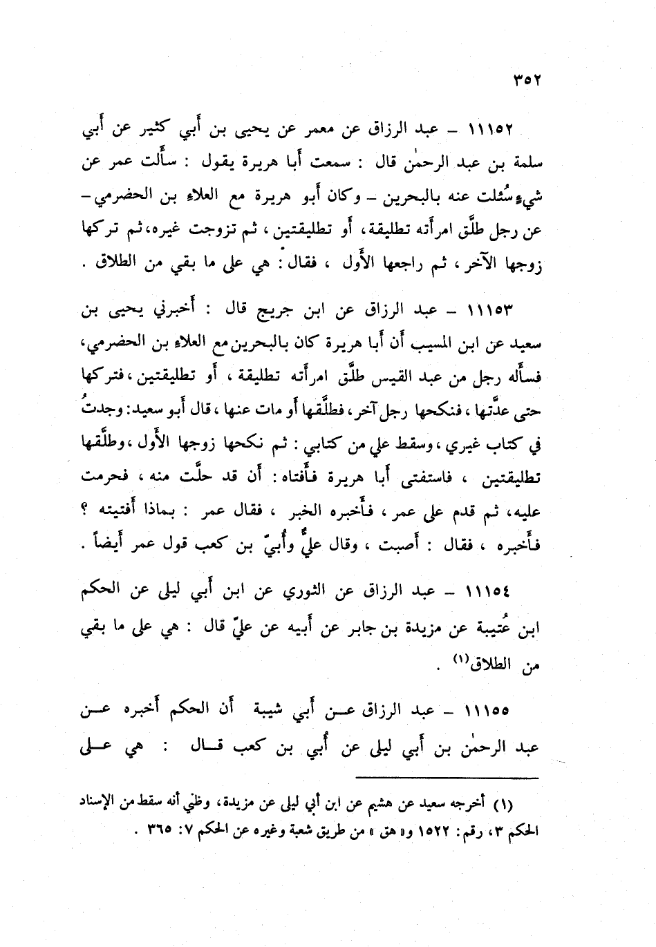 ١١١٥٣ - عَنِ ابْنِ جُرَيْجٍ قَالَ: أَخْبَرَنِي يَحْيَى بْنُ سَعِيدٍ، عَنِ ابْنِ الْمُسَيِّبِ، أَنَّ أَبَا هُرَيْرَةَ كَانَ بِالْبَحْرَيْنِ مَعَ الْعَلَاءِ بْنِ الْحَضْرَمِيِّ، فَسَأَلَهُ رَجُلٌ مِنْ عَبْدِ الْقَيْسِ طَلَّقَ امْرَأَتَهُ تَطْلِيقَةً، أَوْ تَطْلِيقَتَيْنِ فَتَرَكَهَا حَتَّى عِدَّتِهَا فَنَكَحَهَا رَجُلٌ آخَرُ فَطَلَّقَهَا أَوْ مَاتَ عَنْهَا، قَالَ أَبُو سَعِيدٍ: وَجَدْتُ فِي كِتَابِ غَيْرِي، وَسَقَطَ عَلَيَّ مِنْ كِتَابِي، ثُمَّ نَكَحَهَا زَوْجُهَا الْأَوَّلُ وَطَلَّقَهَا تَطْلِيقَتَيْنِ، فَاسْتَفْتَى أَبَا هُرَيْرَةَ فَأَفْتَاهُ «أَنْ قَدْ حَلَّتْ مِنْهُ، فَحُرِّمَتْ عَلَيْهِ»، ثُمَّ قَدِمَ عَلَى عُمَرَ فَأَخْبَرَهُ الْخَبَرَ، فَقَالَ عُمَرُ: بِمَاذَا أَفْتَيْتَهُ؟ فَأَخْبَرَهُ، فَقَالَ: أَصَبْتَ، «وَقَالَ عَلِيٌّ، وَأُبَيُّ بْنُ كَعْبٍ قَوْلَ عُمَرَ أَيْضًا»