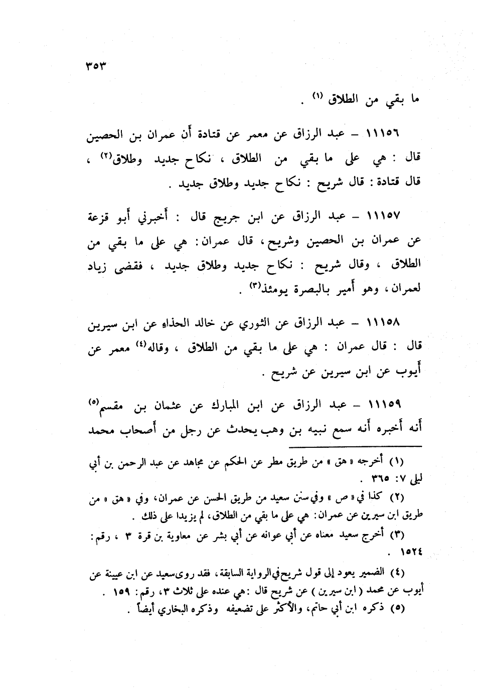 ١١١٥٨ - عَنِ الثَّوْرِيِّ، عَنْ خَالِدٍ الْحَذَّاءِ، عَنِ ابْنِ سِيرِينَ قَالَ: قَالَ عِمْرَانُ: «هِيَ عَلَى مَا بَقِيَ مِنَ الطَّلَاقِ»، وَقَالَهُ مَعْمَرٌ، عَنْ أَيُّوبَ، عَنِ ابْنِ سِيرِينَ، عَنْ شُرَيْحٍ