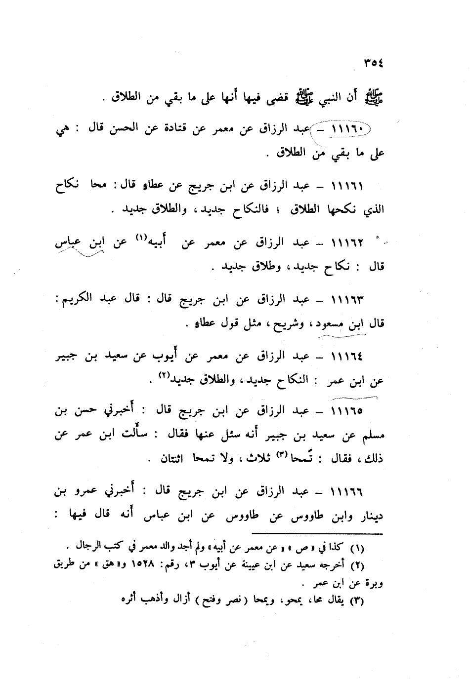 ١١١٦٤ - عَنْ مَعْمَرٍ، عَنْ أَيُّوبَ، عَنْ سَعِيدِ بْنِ جُبَيْرٍ، عَنِ ابْنِ عُمَرَ: «النِّكَاحُ جَدِيدٌ، وَالطَّلَاقُ جَدِيدٌ»