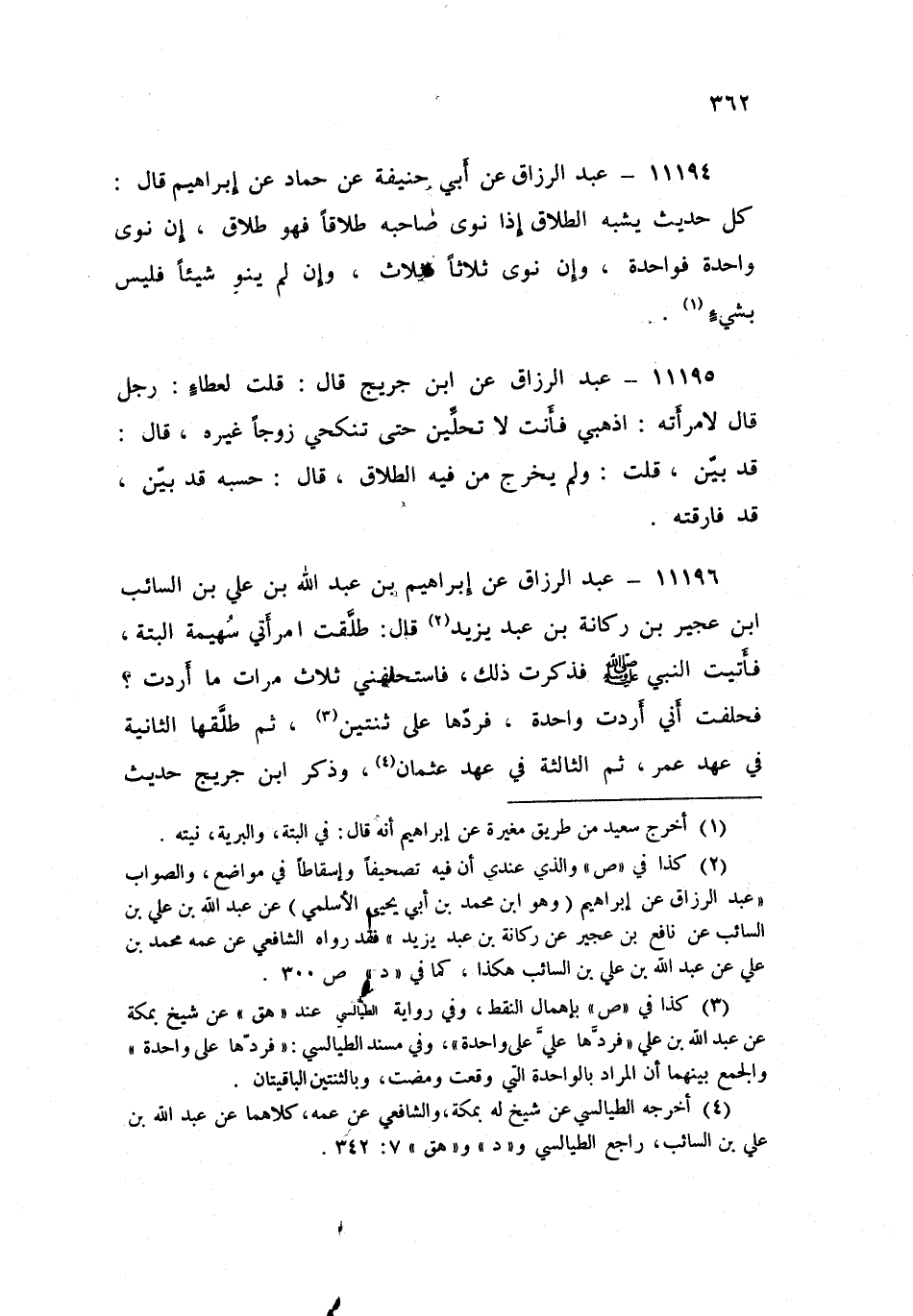 ١١١٩٦ - عَنْ إِبْرَاهِيمَ عَنْ عَبْدِ اللَّهِ بْنِ عَلِيِّ بْنِ السَّائِبِ عَنِ ابْنِ عُجَيْرٍ عَنْ رُكَانَةَ بْنِ عَبْدِ يَزِيدَ قَالَ: «طَلَّقْتُ امْرَأَتِي سُهَيْمَةَ الْبَتَّةَ، فَأَتَيْتُ النَّبِيَّ صَلَّى اللهُ عَلَيْهِ وَسَلَّمَ فَذَكَرْتُ ذَلِكَ، فَاسْتَحْلَفَنِي ثَلَاثَ مَرَّاتٍ مَا أَرَدْتَ، فَحَلَفْتُ أَنِّي أَرَدْتُ وَاحِدَةً، فَرَدَّهَا عَلَى اثْنَتَيْنِ»، ثُمَّ طَلَّقَهَا الثَّانِيَةَ فِي عَهْدِ عُمَرَ، ثُمَّ الثَّالِثَةَ فِي عَهْدِ عُثْمَانَ، وَذَكَرَ ابْنُ جُرَيْجٍ حَدِيثَ أَبِي رُكَانَةَ أَنَّهُ طَلَّقَهَا ثَلَاثًا