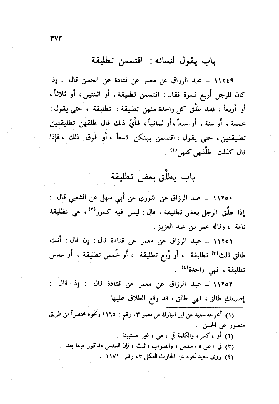 ١١٢٤٩ - عَنْ مَعْمَرٍ، عَنْ قَتَادَةَ، عَنِ الْحَسَنِ قَالَ: " إِذَا كَانَ لِلرَّجُلِ أَرْبَعُ نِسْوَةٍ، فَقَالَ: اقْتَسِمْنَ تَطْلِيقَةً، أَوِ اثْنَتَيْنِ، أَوْ ثَلَاثًا، أَوْ أَرْبَعًا فَقَدْ طَلَّقَ كُلَّ وَاحِدَةٍ مِنْهُنَّ تَطْلِيقَةً تَطْلِيقَةً، حَتَّى يَقُولَ: خَمْسَةً أَوْ سِتَّةً أَوْ سَبْعًا أَوْ ثَمَانِيَةً، فَأَيَّ ذَلِكَ قَالَ طَلَّقَهُنَّ تَطْلِيقَتَيْنِ تَطْلِيقَتَيْنِ، حَتَّى يَقُولَ: اقْتَسِمْنَ بَيْنَكُنَّ تِسْعًا، أَوْ فَوْقَ ذَلِكَ، فَإِذَا قَالَ كَذَلِكَ طَلَّقَهُنَّ كُلَّهُنَّ "