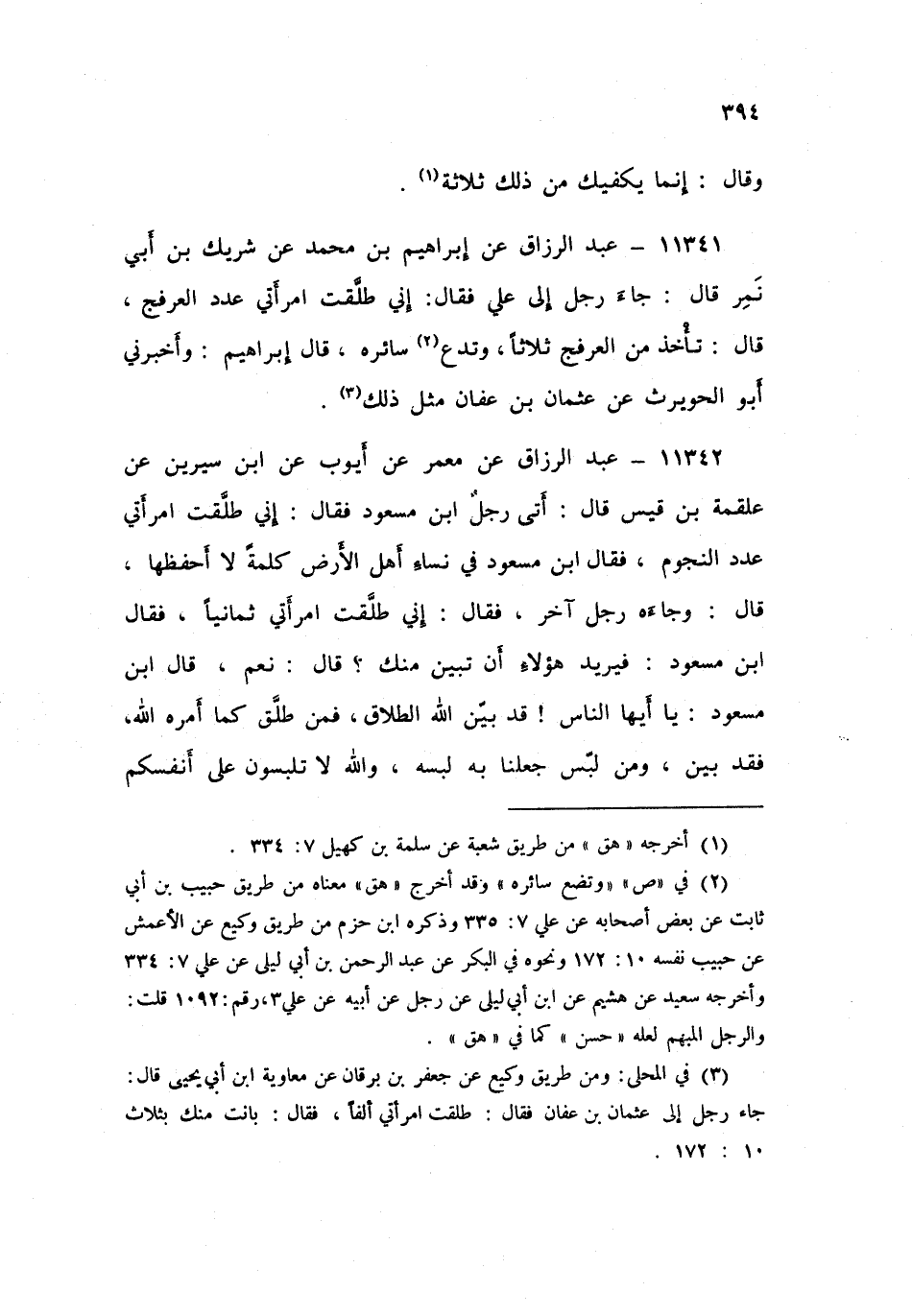 ١١٣٤٢ - عَنْ مَعْمَرٍ، عَنْ أَيُّوبَ، عَنِ ابْنِ سِيرِينَ، عَنْ عَلْقَمَةَ بْنِ قَيْسٍ قَالَ: أَتَى رَجُلٌ ابْنَ مَسْعُودٍ، فَقَالَ: إِنِّي طَلَّقْتُ امْرَأَتِي عَدَدَ النُّجُومِ، فَقَالَ ابْنُ مَسْعُودٍ فِي نِسَاءِ أَهْلِ الْأَرْضِ كَلِمَةً لَا أَحْفَظُهَا قَالَ: وَجَاءَهُ رَجُلٌ آخَرُ، فَقَالَ: إِنِّي طَلَّقْتُ امْرَأَتِي ثَمَانِيًا، فَقَالَ ابْنُ مَسْعُودٍ: «فَيُرِيدُ هَؤُلَاءِ أَنْ تَبِينَ مِنْكَ؟» قَالَ: نَعَمْ، قَالَ ابْنُ مَسْعُودٍ: «يَا أَيُّهَا النَّاسُ قَدْ بَيَّنَ اللَّهُ الطَّلَاقَ، فَمَنْ طَلَّقَ كَمَا أَمَرَهُ اللَّهُ فَقَدْ بَيَّنَ، وَمَنْ لبَّسَ جَعَلْنَا بِهِ لُبْسَهَ، وَاللَّهِ لَا تُلَبِّسُونَ عَلَى أَنْفُسِكُمْ ⦗٣٩٥⦘ ثُمَّ نَحْمِلُهُ عَنْكُمْ، نَعَمْ هُوَ كَمَا يَقُولُ»، قَالَ: وَنَرَى أَنَّ قَوْلَ ابْنِ سِيرِينَ كَلِمَةً لَا أَحْفَظُهَا، أَنَّهُ قَالَ: «لَوْ كَانَ عِنْدَهُ نِسَاءُ أَهْلِ الْأَرْضِ، ثُمَّ قَالَ هَذَا ذَهَبْنَ كُلُّهُنَّ»