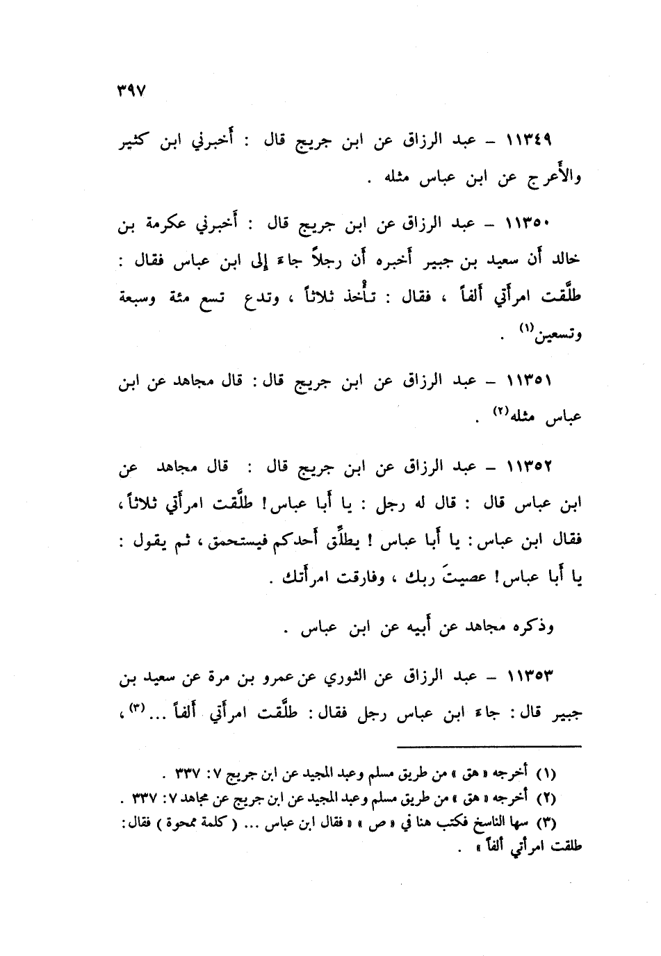 ١١٣٥٠ - عَنِ ابْنِ جُرَيْجٍ قَالَ: أَخْبَرَنِي عِكْرِمَةُ بْنُ خَالِدٍ، أَنَّ سَعِيدَ بْنِ جُبَيْرٍ، أَخْبَرَهُ أَنَّ رَجُلًا جَاءَ إِلَى ابْنِ عَبَّاسٍ، فَقَالَ: طَلَّقْتُ امْرَأَتِي أَلْفًا، فَقَالَ: «تَأْخُذُ ثَلَاثًا، وَتَدَعُ تِسْعَ مِائَةٍ وَسَبْعَةً وَتِسْعِينَ». عَبْدُ الرَّزَّاقِ،