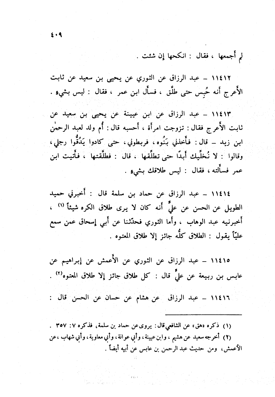 ١١٤١٤ - عَنْ حَمَّادِ بْنِ سَلَمَةَ قَالَ: أَخْبَرَنِي حُمَيْدٌ الطَّوِيلُ، عَنِ الْحَسَنِ، عَنْ عَلِيٍّ: «أَنَّهُ كَانَ لَا يَرَى طَلَاقَ الْكُرْهِ شَيْئًا»، أَخْبَرَنِيهِ عَبْدُ الْوَهَابِ، وَأَمَّا الثَّوْرِيُّ فَحَدَّثَنَا، عَنْ أَبِي إِسْحَاقَ، عَمَّنْ، سَمِعَ عَلِيًّا يَقُولُ: «الطَّلَاقُ كُلُّهُ جَائِزٌ إِلَّا طَلَاقَ الْمَعْتُوهِ»
