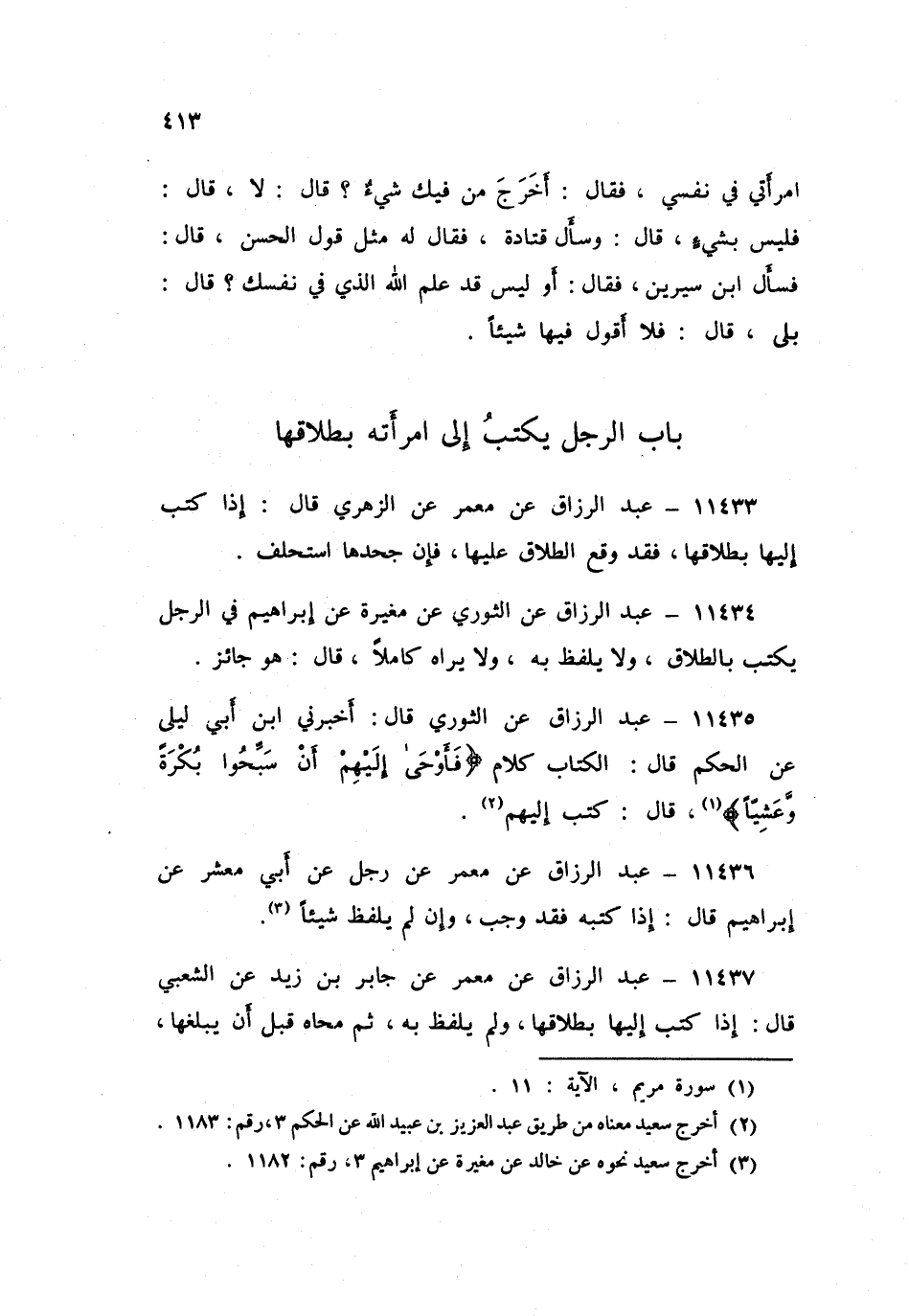 ١١٤٣٥ - عَنِ الثَّوْرِيِّ قَالَ: أَخْبَرَنِي ابْنُ أَبِي لَيْلَى، عَنِ الْحَكَمِ قَالَ: «الْكِتَابُ كَلَامٌ»، {فَأَوْحَى إِلَيْهِمْ أَنْ سَبِّحُوا بُكْرَةً وَعَشِيًّا} [مريم: ١١] قَالَ: «كَتَبَ إِلَيْهِمْ»