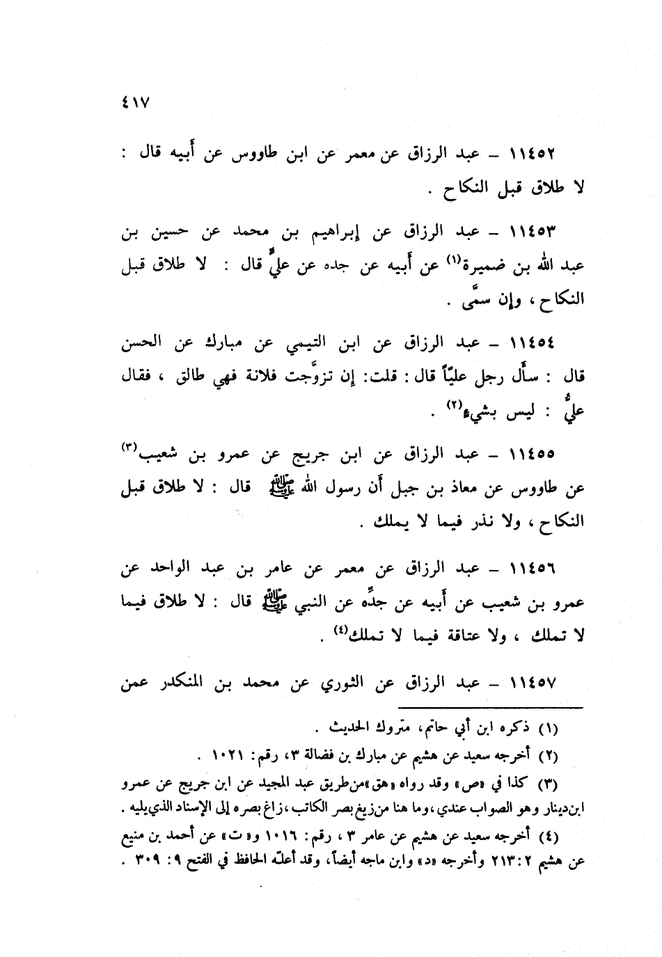 ١١٤٥٥ - عَنِ ابْنِ جُرَيْجٍ، عَنْ عَمْرِو بْنِ شُعَيْبٍ، عَنْ طَاوُسٍ، عَنْ مُعَاذِ بْنِ جَبَلٍ، أَنَّ رَسُولَ اللَّهِ صَلَّى اللهُ عَلَيْهِ وَسَلَّمَ قَالَ: «لَا طَلَاقَ قَبْلَ النِّكَاحِ، وَلَا نَذْرَ فِيمَا لَا يُمْلَكُ»