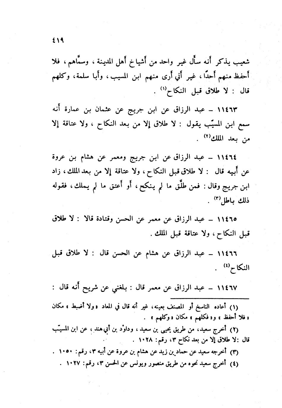 ١١٤٦٤ - عَنِ ابْنِ جُرَيْجٍ، وَمَعْمَرٍ، عَنْ هِشَامِ بْنِ عُرْوَةَ، عَنْ أَبِيهِ قَالَ: «لَا طَلَاقَ قَبْلَ النِّكَاحِ، وَلَا عَتَاقَةَ إِلَّا مِنْ بَعْدِ الْمِلْكِ». زَادَ ابْنُ جُرَيْجٍ، وَقَالَ: «فَمَنْ طَلَّقَ مَا لَمْ يَنْكِحْ، أَوْ أَعْتَقَ مَا لَمْ يَمْلِكْ فَقَوْلُهُ ذَلِكَ بَاطِلٌ»