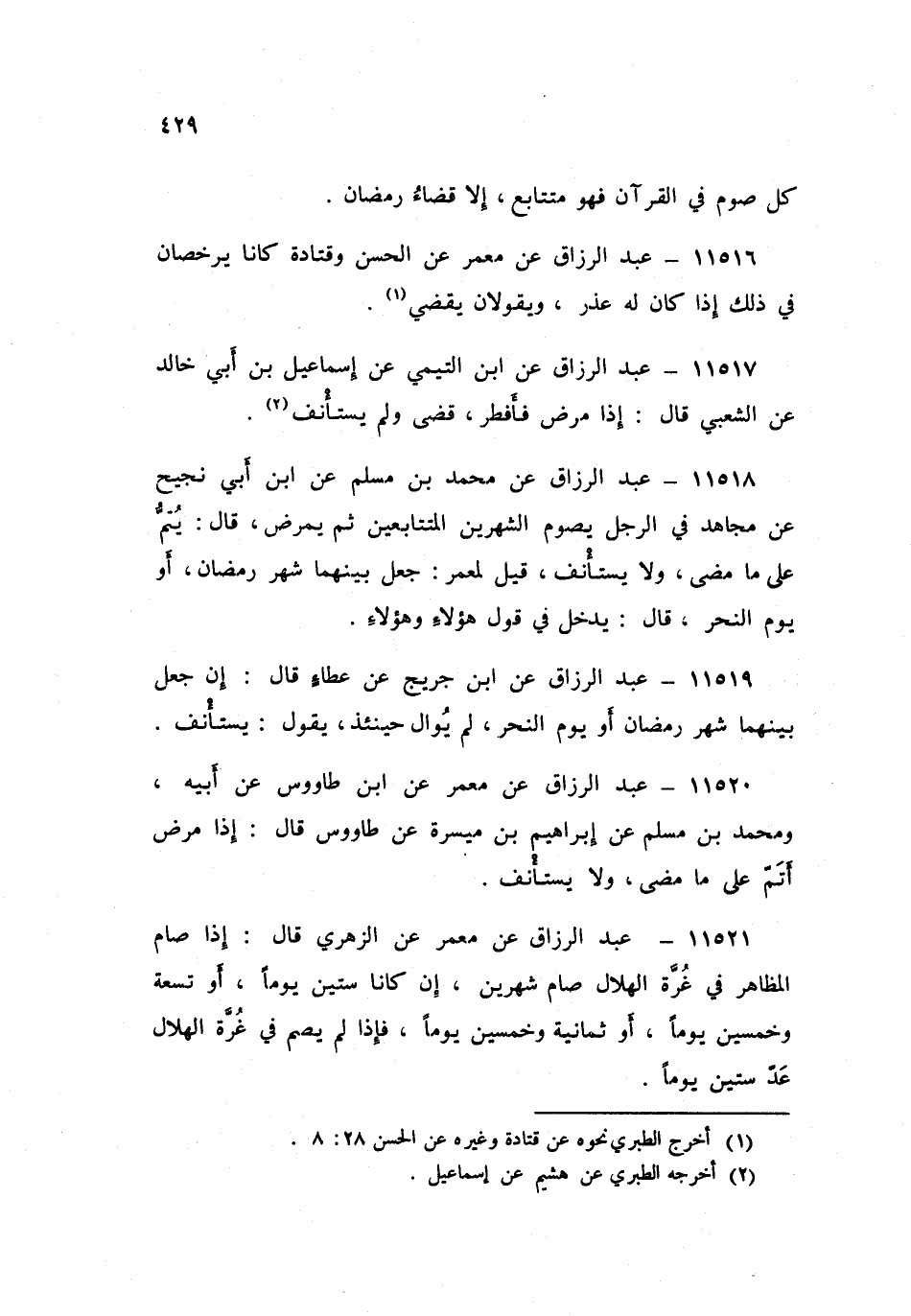 ١١٥١٨ - عَنْ مُحَمَّدِ بْنِ مُسْلِمٍ، عَنِ ابْنِ أَبِي نَجِيحٍ، عَنْ مُجَاهِدٍ فِي الرَّجُلِ يَصُومُ الشَّهْرَيْنِ الْمُتَتَابِعَيْنِ ثُمَّ يَمْرَضُ قَالَ: «يُتِمُّ عَلَى مَا مَضَى، وَلَا يَسْتَأْنِفُ»، قِيلَ لِمَعْمَرٍ: جَعَلَ بَيْنَهُمَا شَهْرَ رَمَضَانَ، أَوْ يَوْمَ النَّحْرِ قَالَ: «يَدْخُلُ فِي قَوْلِ هَؤُلَاءِ وَهَؤُلَاءِ»