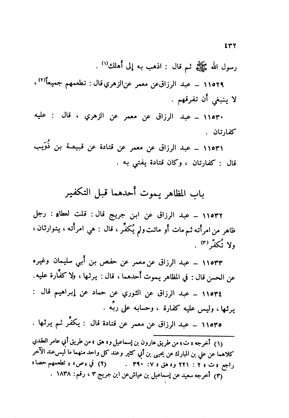 ١١٥٣١ - عَنْ مَعْمَرٍ، عَنْ قَتَادَةَ، عَنْ قَبِيصَةَ بْنِ ذُوَيْبٍ قَالَ: «كَفَّارَتَانِ»، وَكَانَ قَتَادَةُ يُفْتِي بِهِ